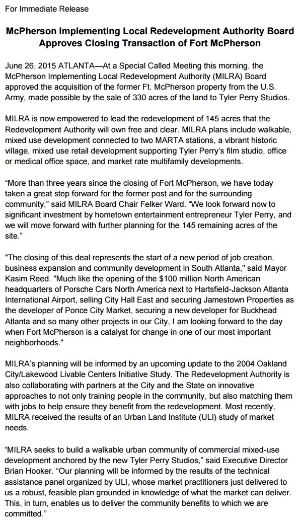 A new master planning process under the Atlanta Regional Commission’s Livable Cities Initiative is expected to begin next month. It will examine development alternatives for the MILRA land that Perry didn’t buy, and explore not only the post, but areas including the Oakland City MARTA station just north of it, where the transit agency is exploring development of its parking lots, and the western extension of the Atlanta Beltline.
