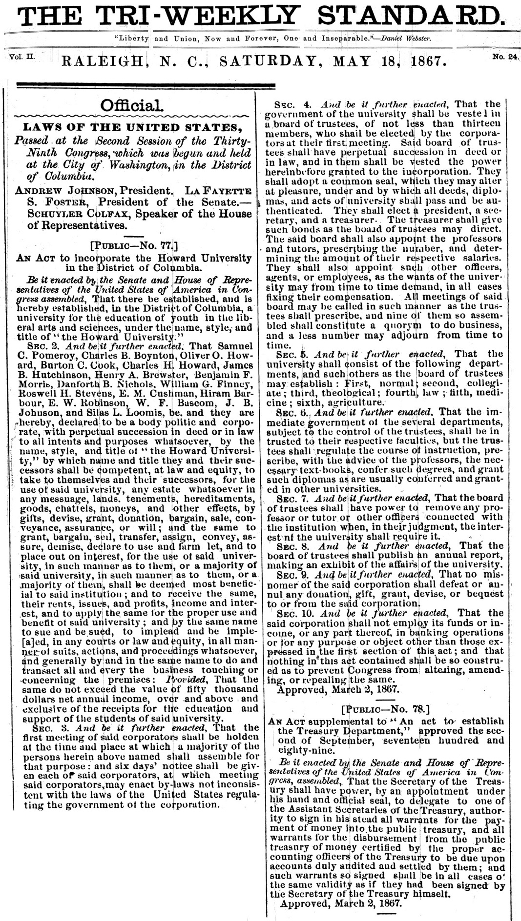 General Oliver O. Howard is the founder of the university and was at the time the president of the “Freedman’s Bureau.” He along with the First Congregational Society created an institution to teach theology to African American clergymen and it expanded into Liberal Arts and Medicine. Although the intent was to “uplift African Americans, especially those recently freed from slavery” the university was open to all races and both sexes. On May 1, 1867, Howard University opened with 5 white female students.