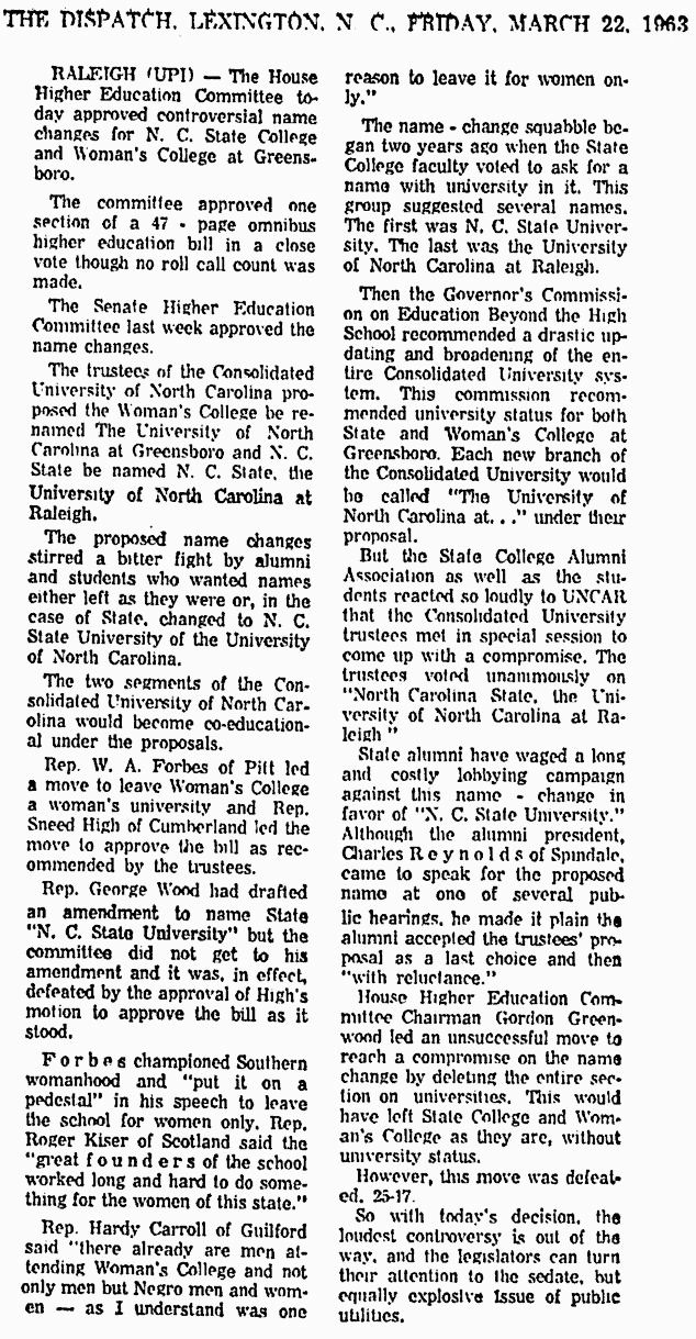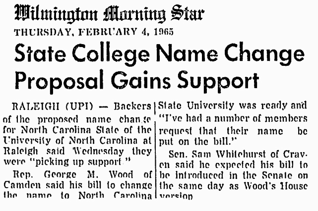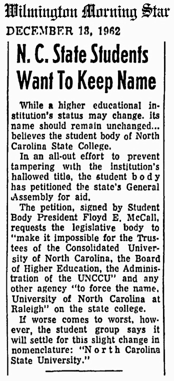 North Carolina State College becomes University of North Carolina at Raleigh (UNC Raleigh or UNCR)