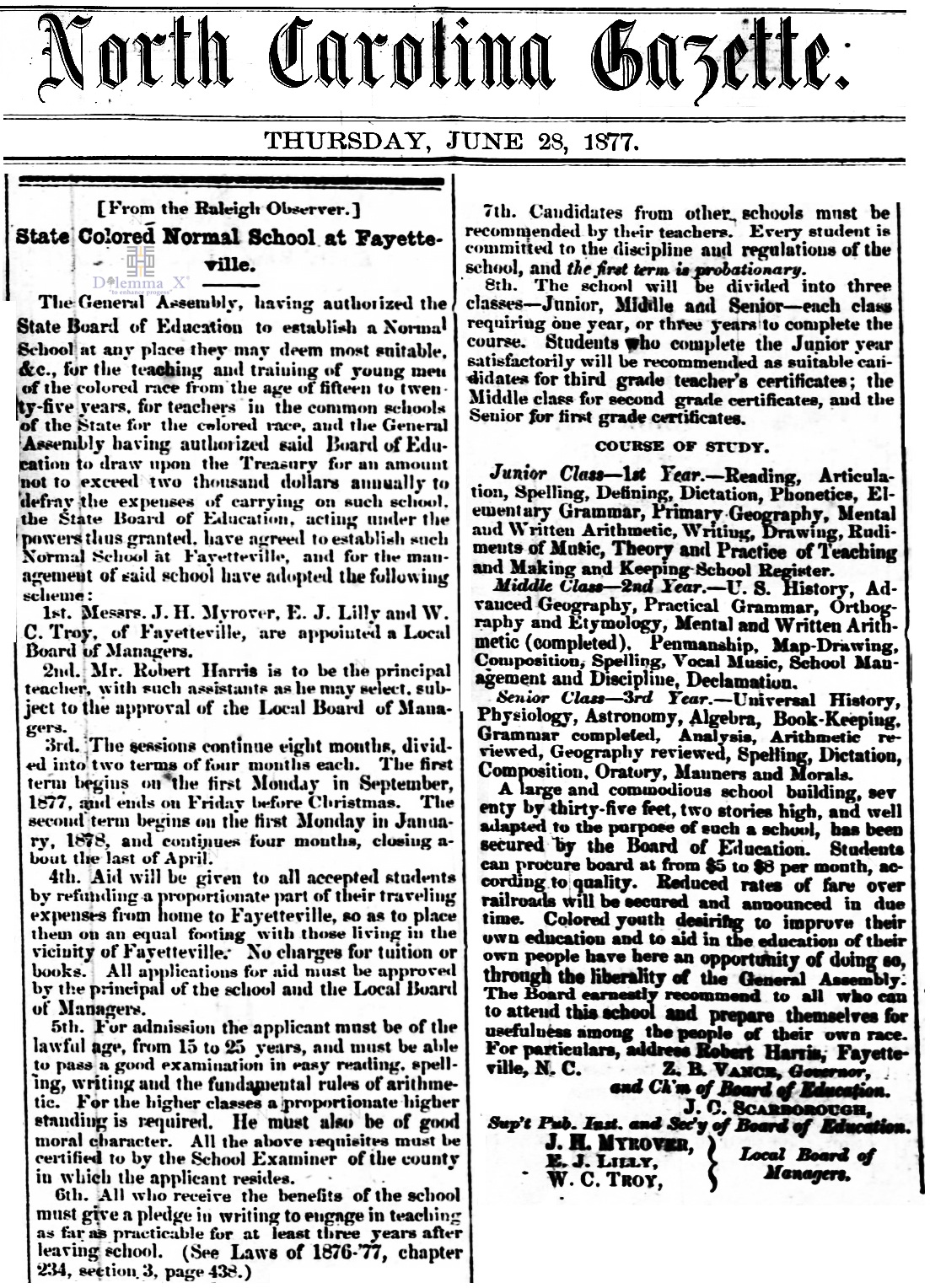 Creating what is now Fayetteville State University as the state’s first public university for African Americans from the former Howard School, founded by Oliver Otis Howard (who also founded Howard University)
