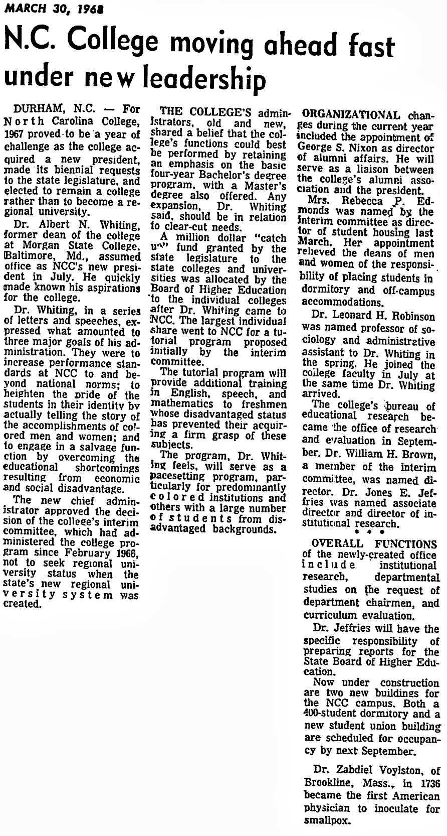 North Carolina College (NCC) gains university status and is re-branded NCCU