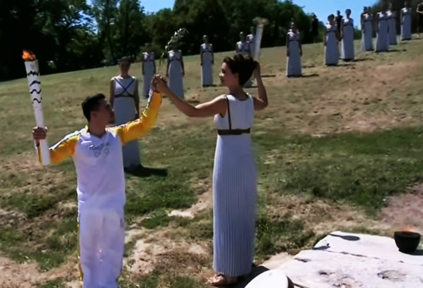 An actor performing the role of high priestess lit the torch by using the sun’s rays.