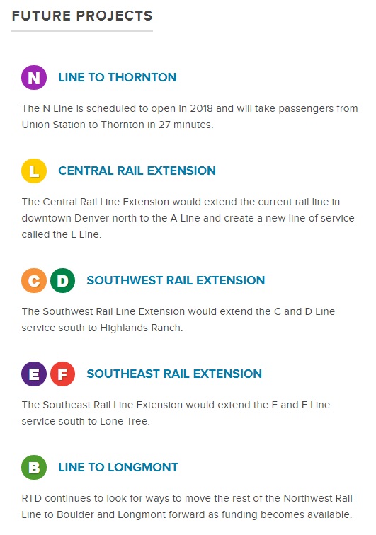 Denver RTD is amidst a $7 billion program to add 122 miles of new commuter and light rail, 18 miles of bus rapid transit service, and enhanced bus service. Three new rapid rail lines serving suburban Denver are set to open later in 2016.