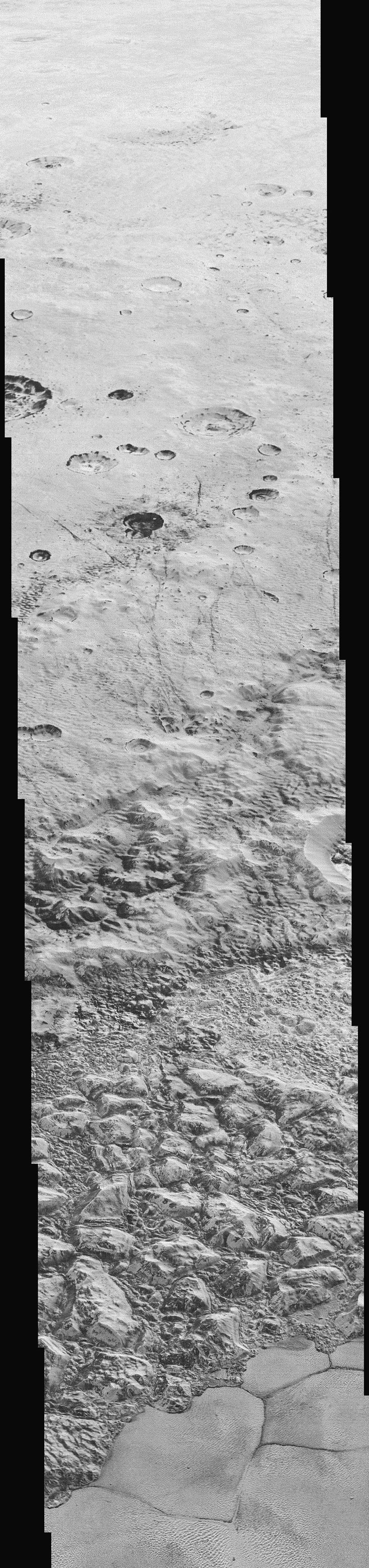 The view extends from the “limb” of Pluto at the top of the strip, almost to the “terminator” (or day/night line) in the southeast of the encounter hemisphere, seen below. The width of the strip ranges from more than 55 miles (90 kilometers) at its northern end to about 45 miles (75 kilometers) at its southern point. The perspective changes greatly along the strip: at its northern end, the view looks out horizontally across the surface, while at its southern end, the view looks straight down onto the surface.