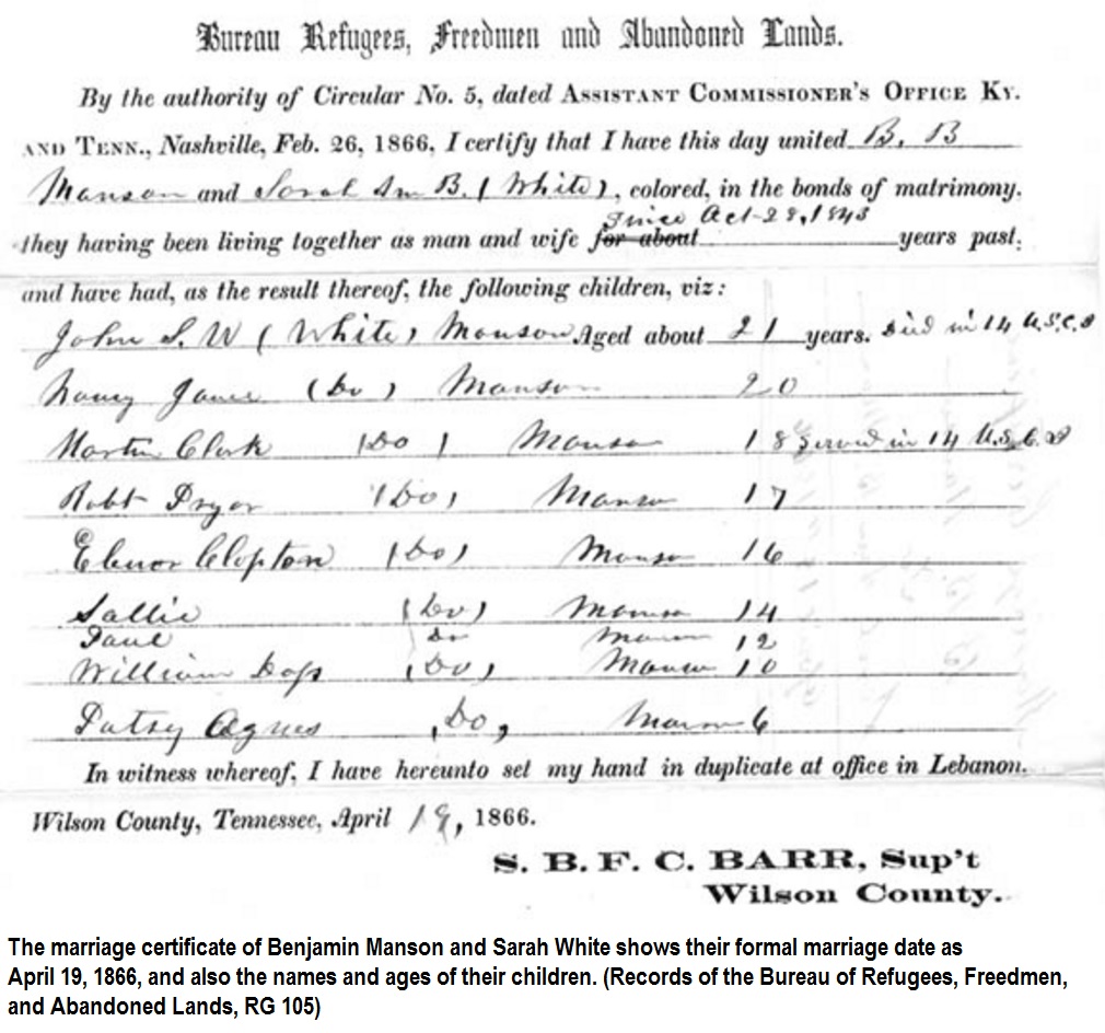 On April 19, 1866, formerly enslaved Benjamin Berry Manson and Sarah Ann Benton White received an official marriage certificate from the Freedmen’s Bureau, officially known as the Bureau of Refugees, Freedmen, and Abandoned Lands.