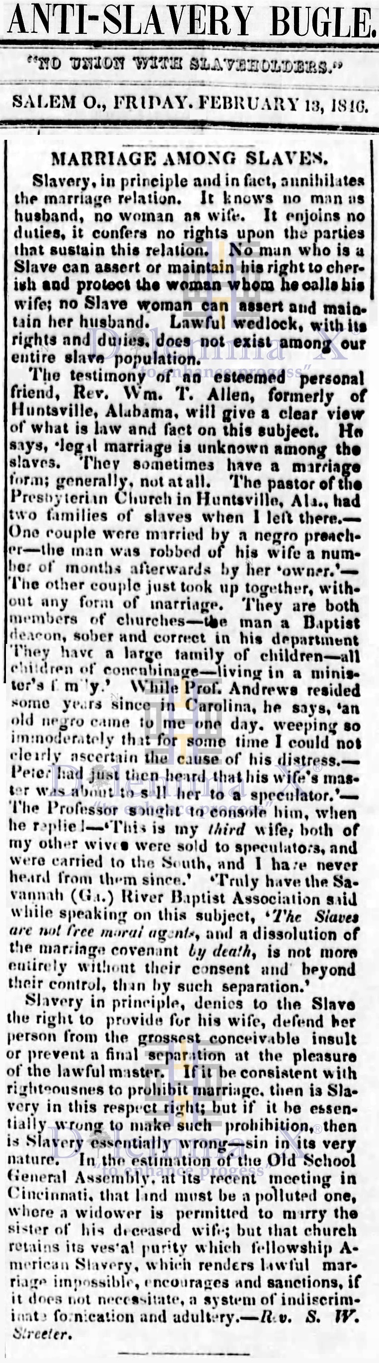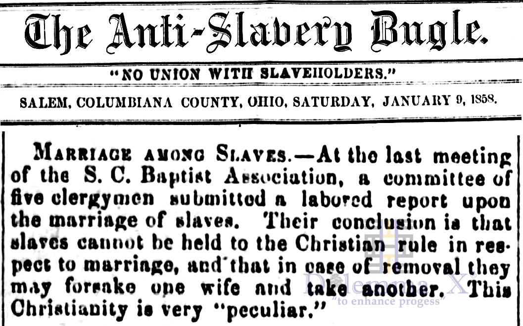 Dilemma X takes this time to reflect on the institution of marriage during the time of the enslavement of Africans in the United States of America. Historical newspaper articles reflect the conversations that were taking place across this nation.