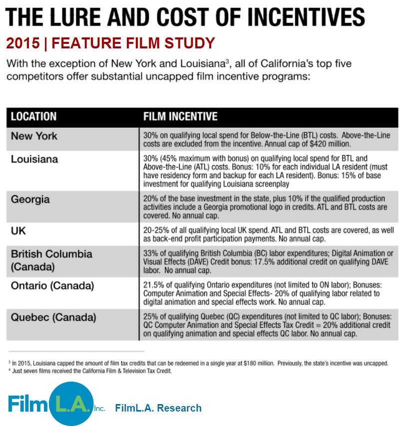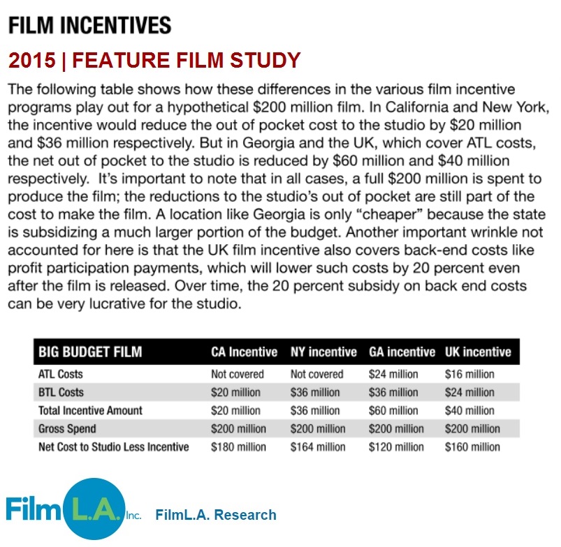 In competing locations like Georgia and the United Kingdom the film incentive programs cover both ATL and BTL costs. Under Georgia’s 30% incentive and the UK’s 20-25% incentive, a ilm that paid $10 million to an actor would receive $3 million or $2-$2.5 million in the respective locations. On average, ATL costs tend to represent 30-40 percent of the total budget, and sometimes 50 percent or more.