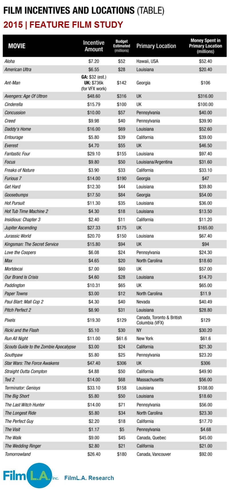 For the last three years, FilmL.A. Research has endeavored to track the movies released in 2013, 2014 and now 2015 to determine where they were ilmed, why they ilmed in the locations they did and how much was spent to produce them.