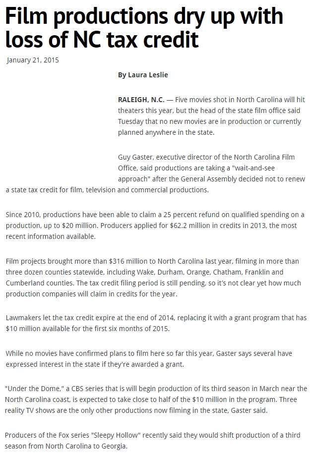 In 2014, after proponents of film incentives waged an intense debate, the N.C. General Assembly ended its 25 percent tax credits on spending and instead offered $10 million in grants.