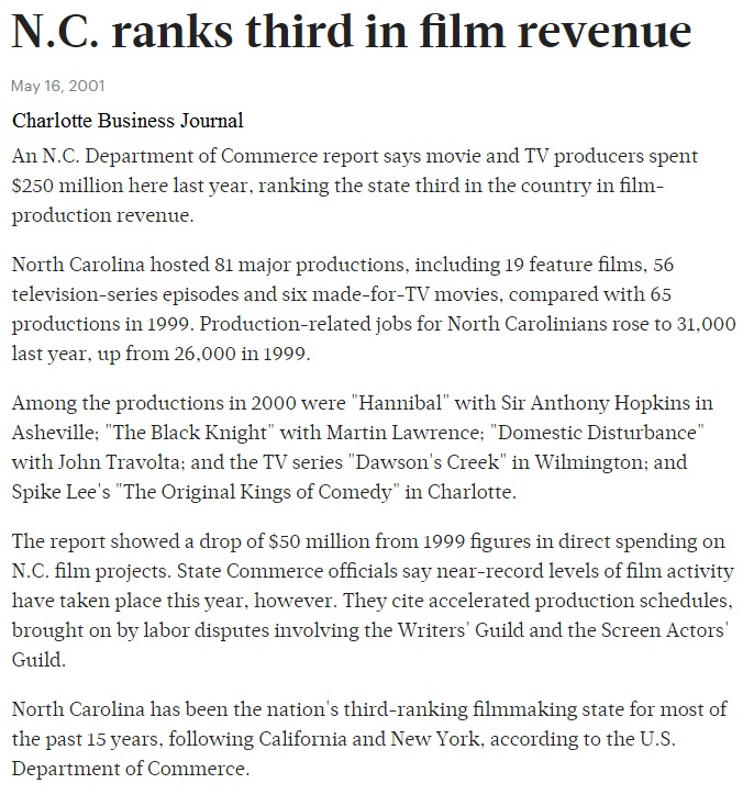 In 2000, North Carolina had competition from states that put money away to lure the film business.