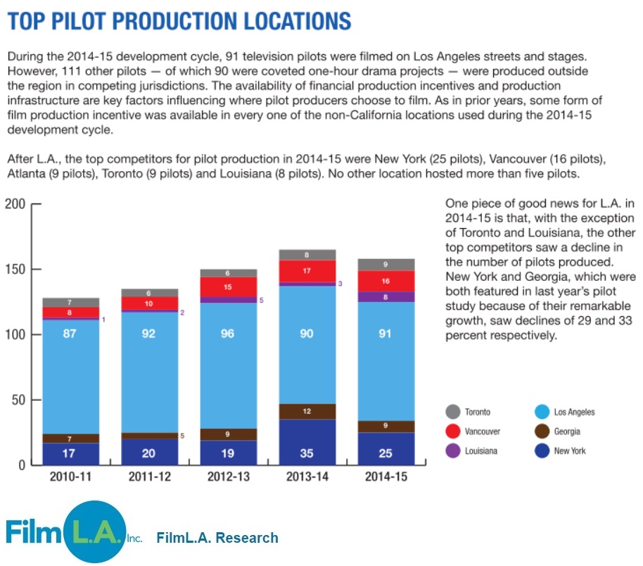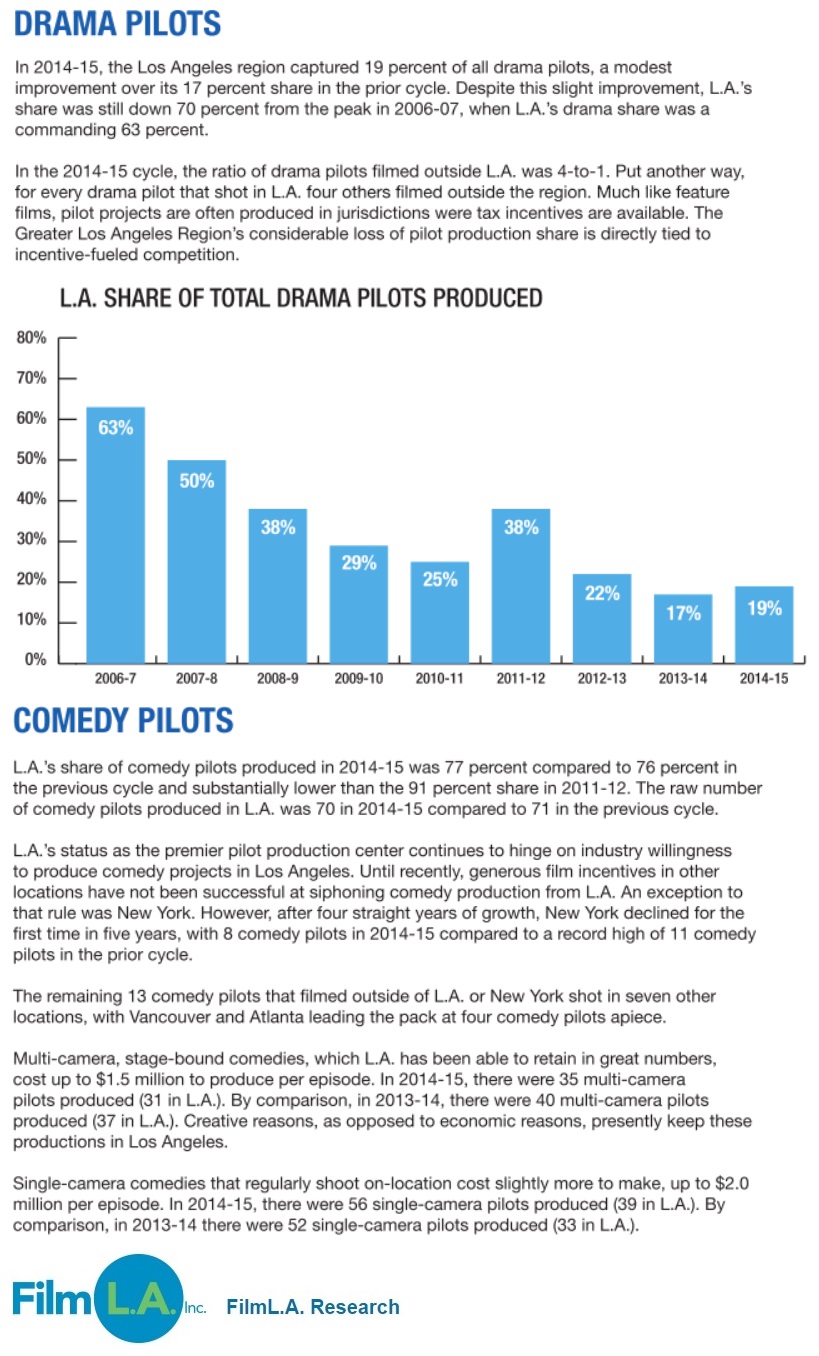 FilmL.A.’s oficial count shows that 202 broadcast, cable and digital pilots (111 Dramas, 91 Comedies) were produced during the 2014-15 development cycle, one less than the prior year, which was the most productive on record by a large margin. Out of those 202 pilots, a total of 91 projects (21 Dramas, 70 Comedies) were ilmed in the Los Angeles region.