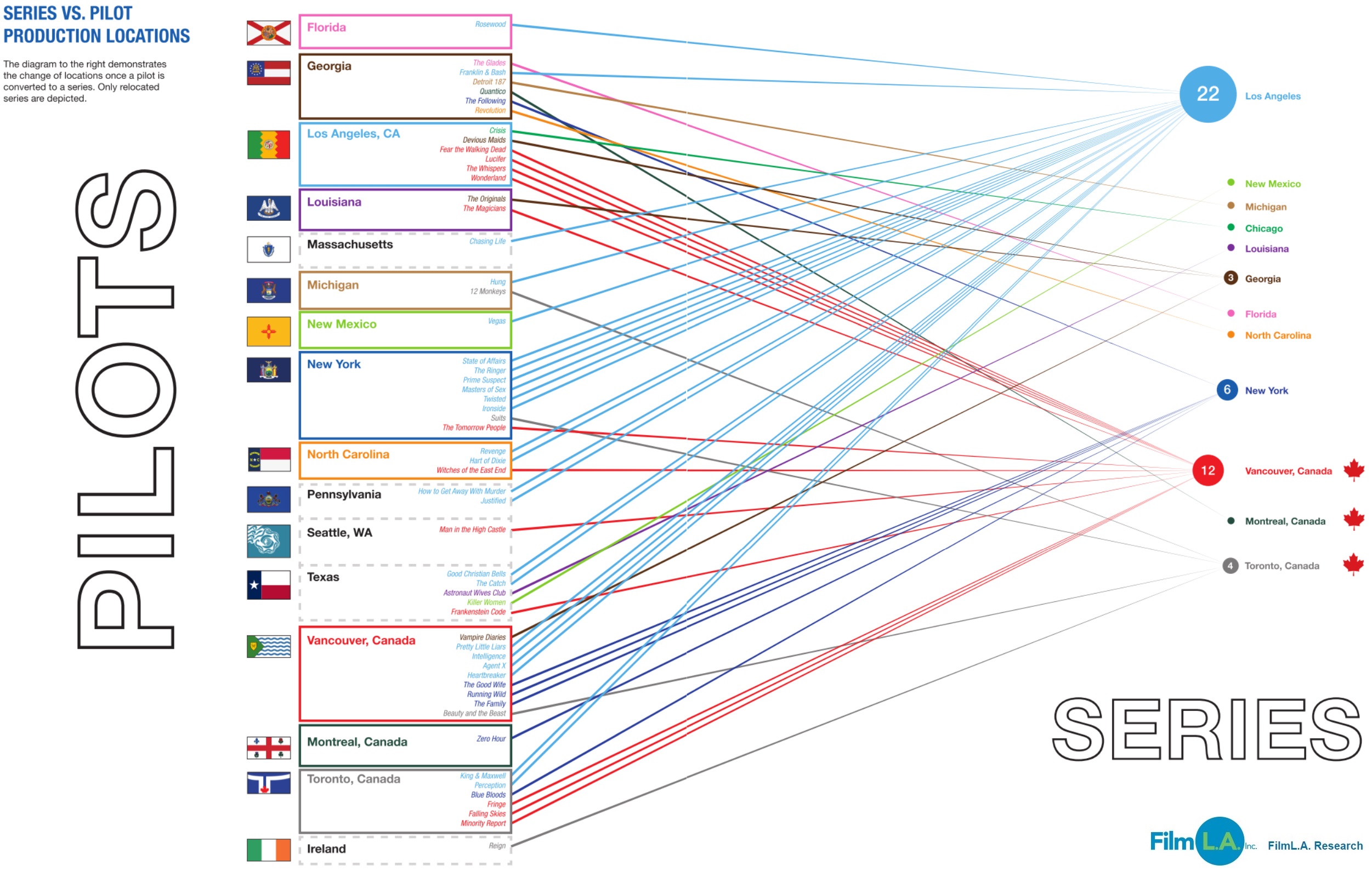However, Los Angeles isn’t the only place in North America hosting pilot production. Other jurisdictions, most notably New York and the Canadian city of Vancouver have established themselves as strong competitors for this lucrative part of Hollywood’s business tradition. Below these top competitors is a second-tier of somewhat smaller players in Georgia, Louisiana and Ontario, Canada— home to Toronto.