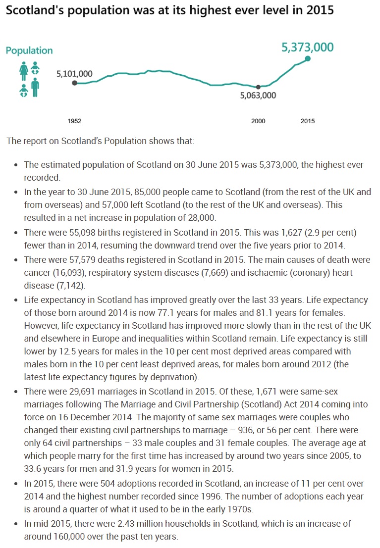 As well as more people moving to Scotland than leaving, fewer babies were born during 2015 and there were more deaths than in 2014.