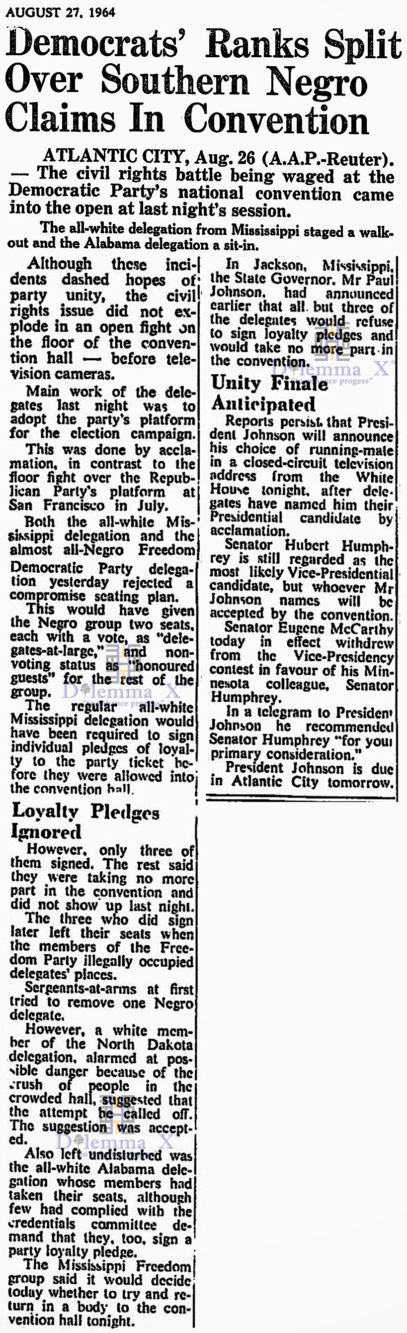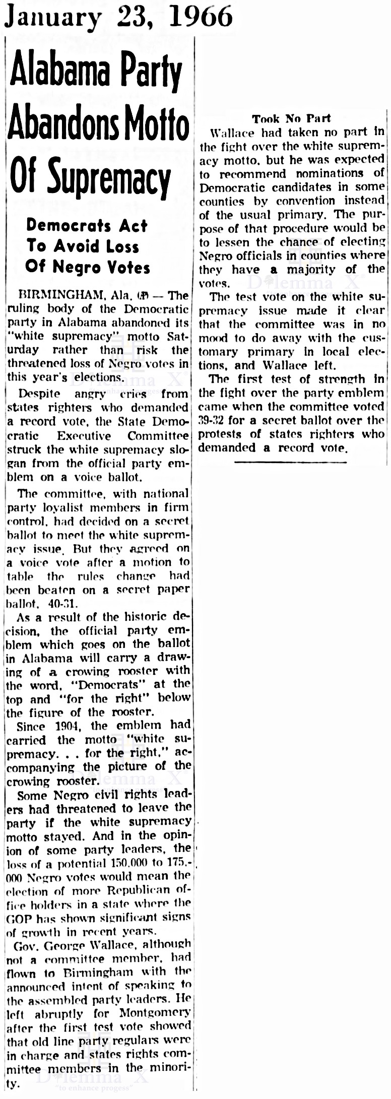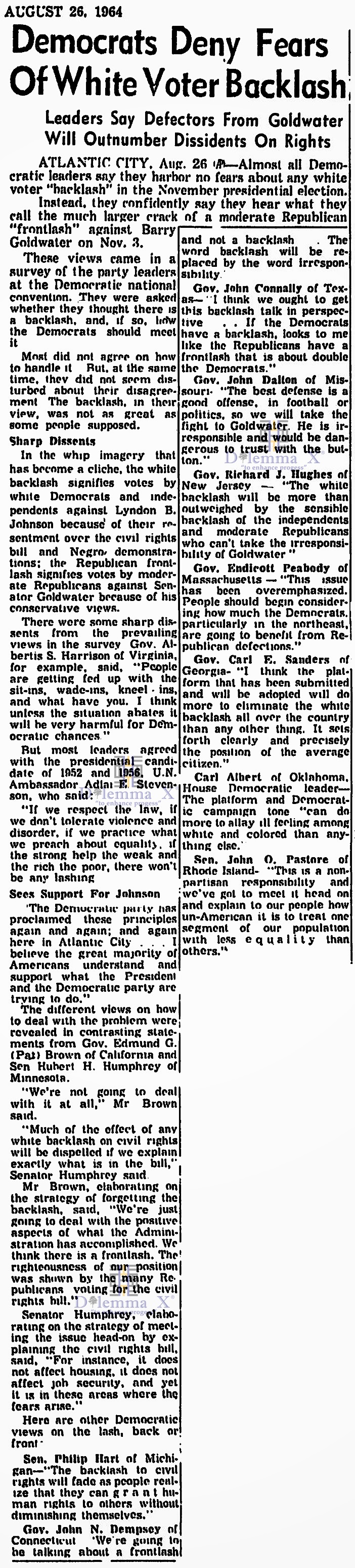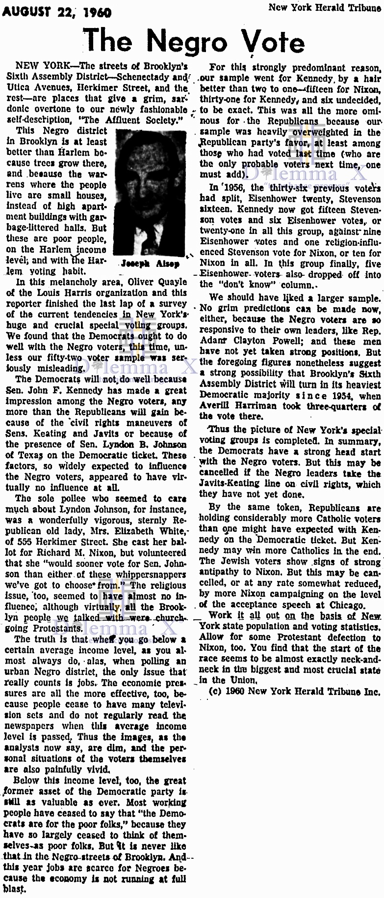 Below is a collection of historical newspaper articles taking a look back at racial voting patterns and political strategies within the Democratic Party and the Republican Party. It is shows America as it was, from the media’s viewpoints, during the actual time periods.