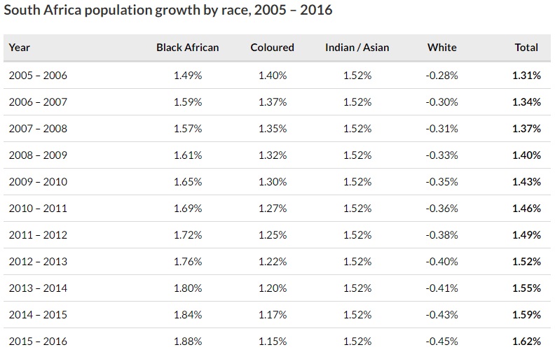 Every population group has shown an increase in numbers, except for the country’s white population, which has declined.