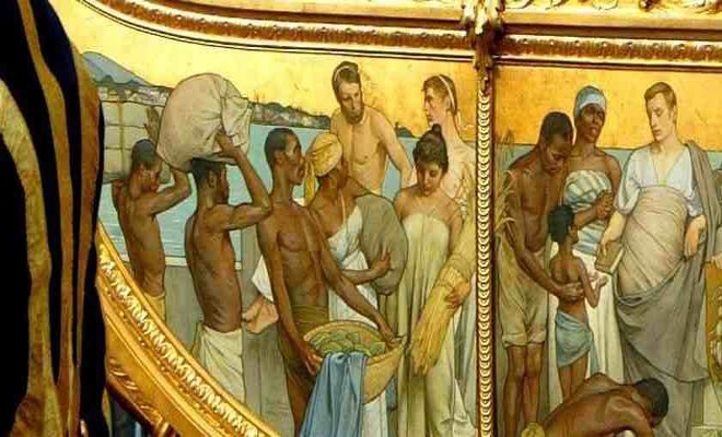 The “Golden Carriage” was given to Queen Wilhelmina from the people of Amsterdam as a gift in 1898. The painting by Nicolaas van der Waay was intended to recreate the style of the country’s 17th-century “Golden Age,” in which Amsterdam became wealthy as the hub of a naval empire. It depicts enslaved Africans.