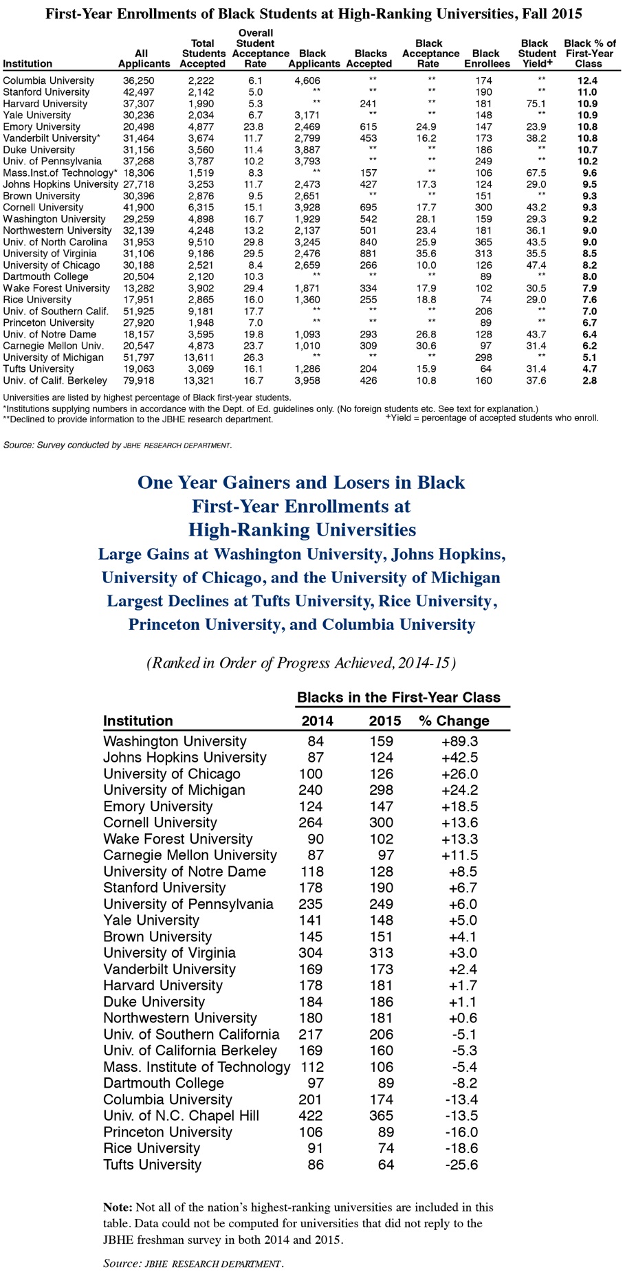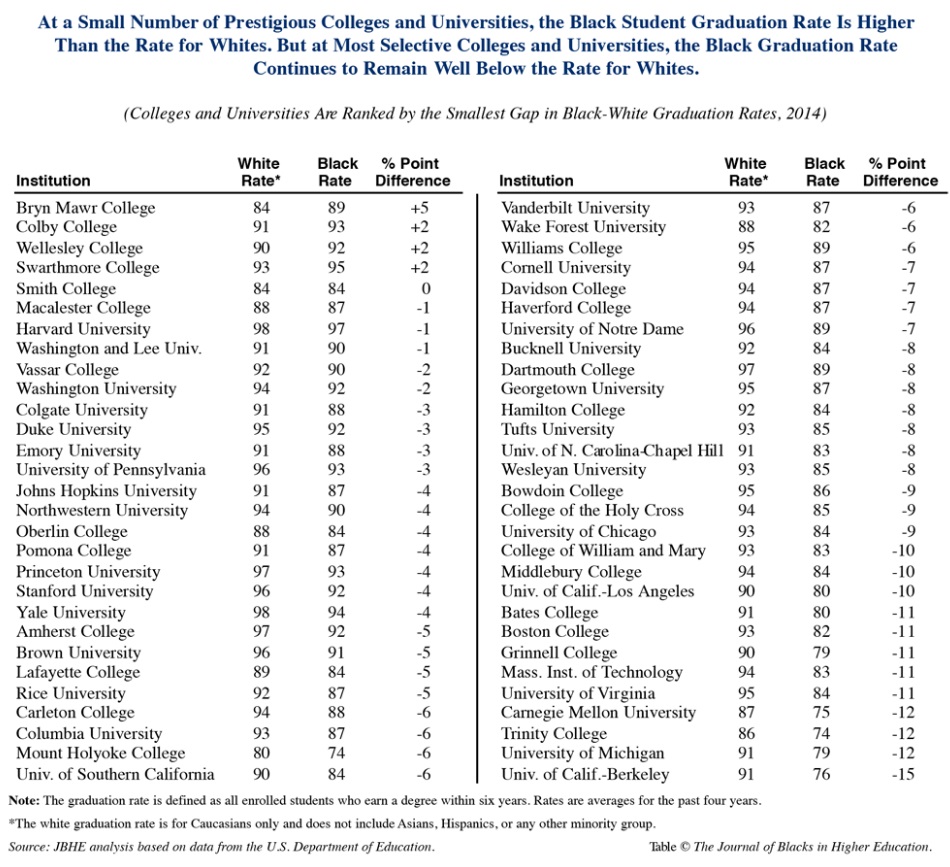 Reported in The Journal of Blacks in Higher Education 2014 – Research has found 15 high-ranking colleges and universities that have Black student graduation rates that have averaged over 90 percent over the past four years. The highest rate is at Harvard University, where 97 percent of entering Black students earn their degree within six years at Harvard. At Swarthmore College in Pennsylvania, the Black student graduate rate is 95 percent. Blacks at Yale University graduate at a rate of 94 percent and Princeton University, Colby College, and the University of Pennsylvania have Black student graduation rates of 93 percent.