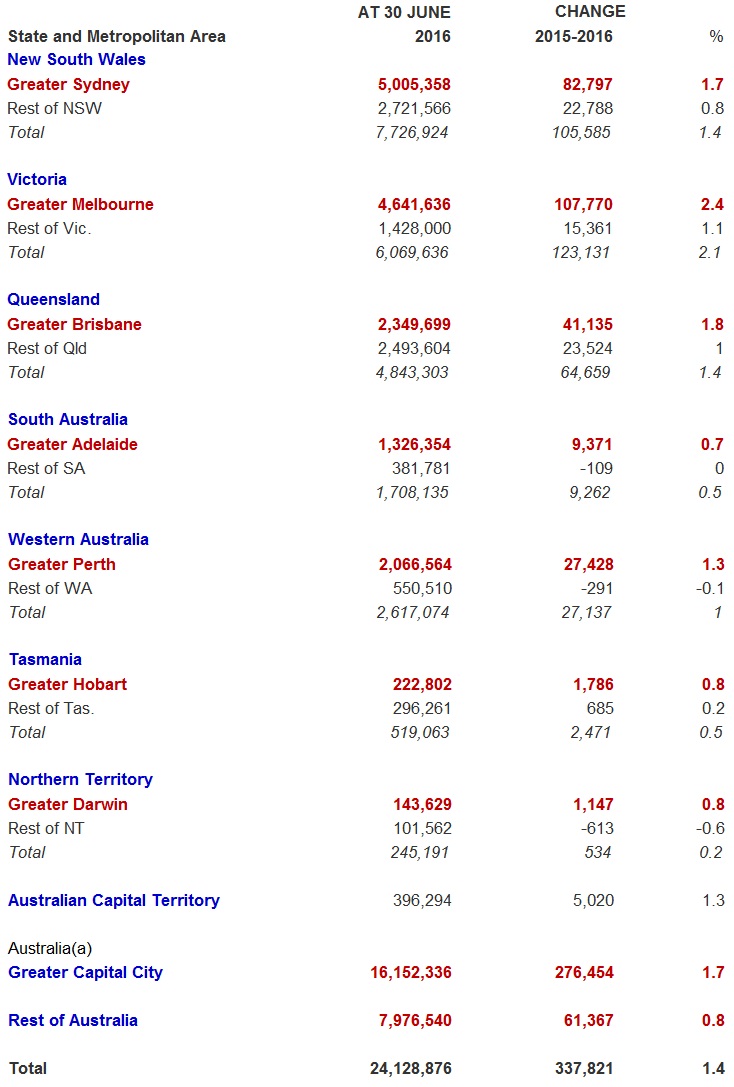 - The combined population of Greater Capital Cities increased by 276,500 people (1.7%) between 30 June 2015 and 30 June 2016, accounting for 82% of the country’s total population growth.