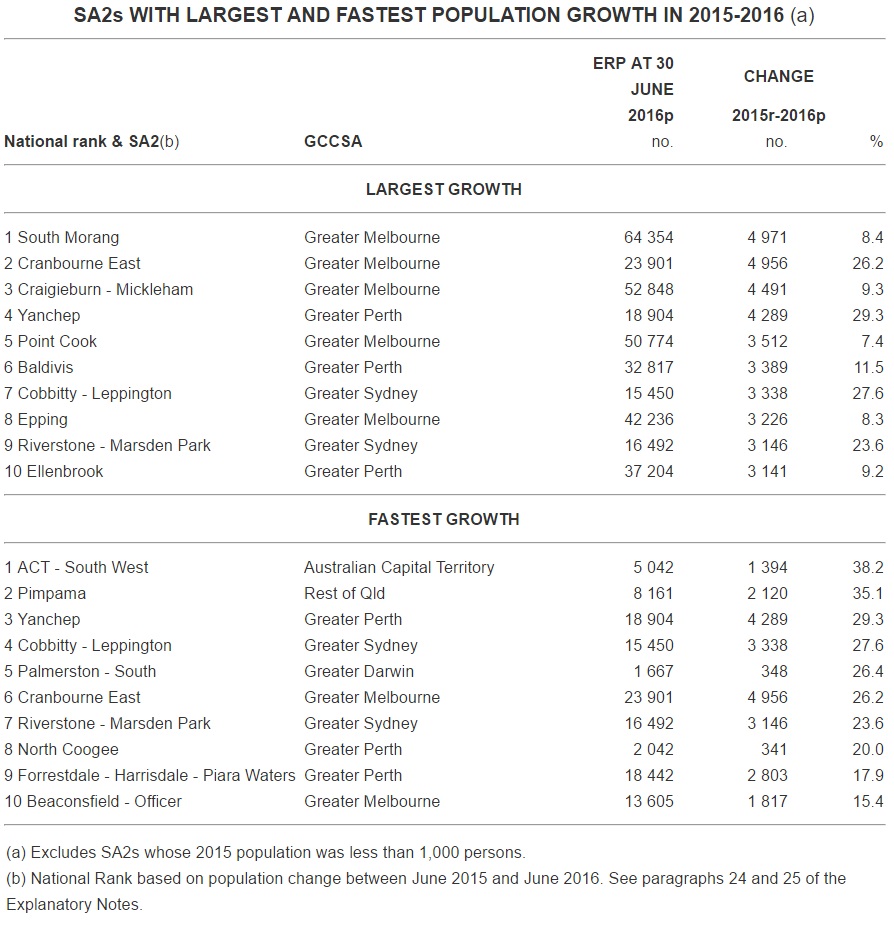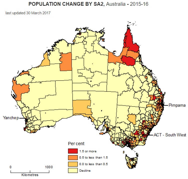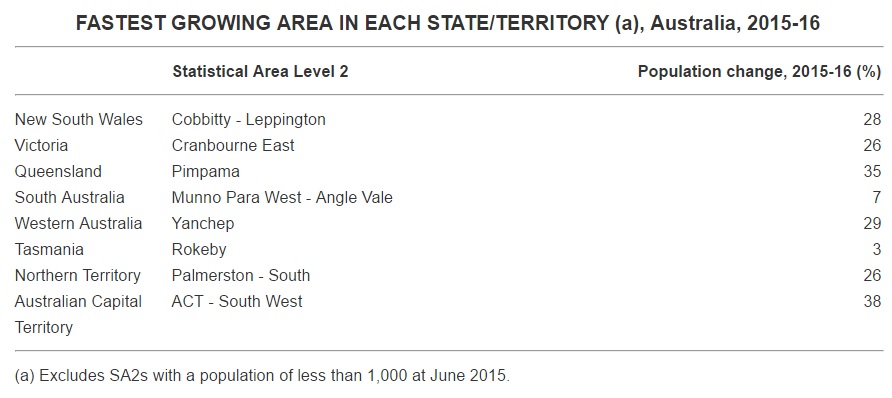 The fastest growing area in Australia in 2015-16 was ACT – South West, which grew by 38 per cent. This area includes the recently developed suburbs of Wright and Coombs. Other areas experiencing fast growth included Pimpama (35 per cent) on the Gold Coast, the coastal area of Yanchep (29 per cent) in Perth’s north and Cobbitty – Leppington (28 per cent) in Sydney’s outer south-west.