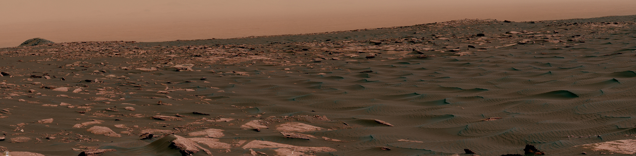 This 360-degree mosaic from the Mast Camera (Mastcam) on NASA’s Curiosity Mars rover looks out over a portion of the Bagnold Dunes, which stretch for several miles. From early February to early April 2017, the rover examined four sites near linear dunes for comparison with what it found in late 2015 and early 2016 during its investigation of crescent-shaped dunes. This two-phase campaign is the first close-up study of active dunes anywhere other than Earth.