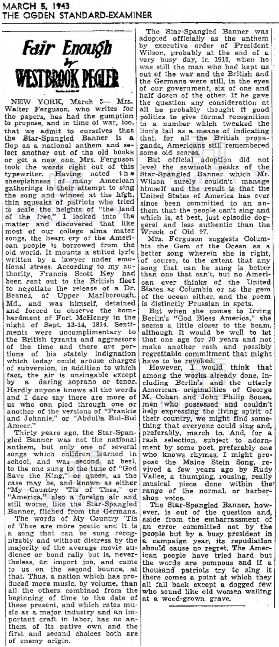 During contemporary times it can be easy to assume the that “The Star Spangled Banner” has always been popular or has always been part of the NFL. Below are just a few historical newspaper articles showing how “The Star Spangled Banner” has not always been a popular patriotic American song for American citizens. These historical articles also show when it became popular to use the “The Star Spangled Banner” during NFL football games, mainly due to World War II.