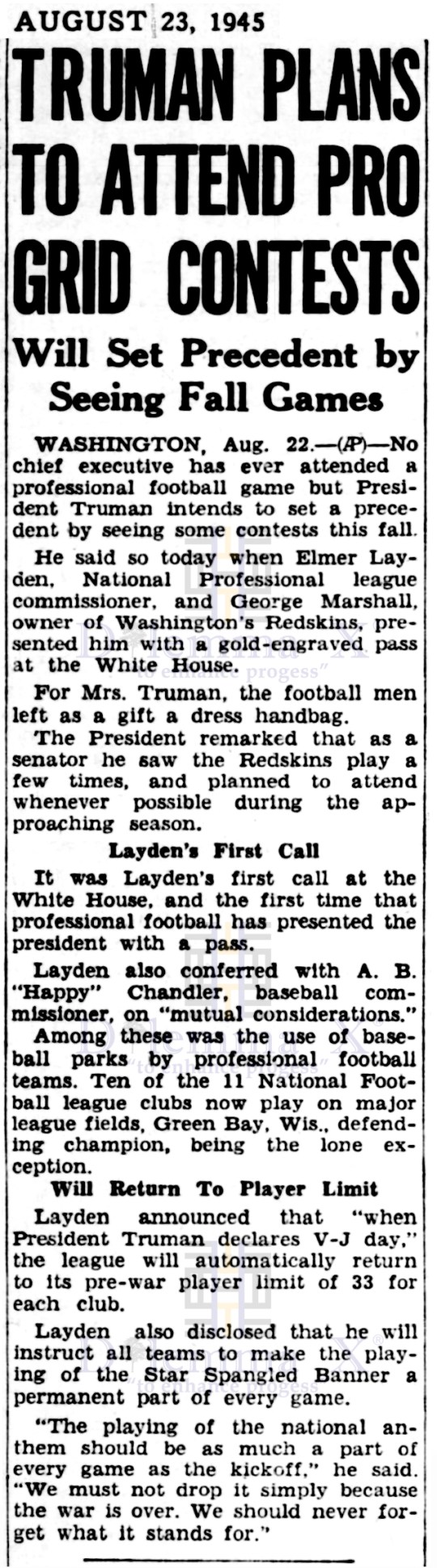 Elmer F. Layden (NFL Comissioner from 1941-1946) instructs all NFL franchises to perform “The Star Spangled Banner” at all games