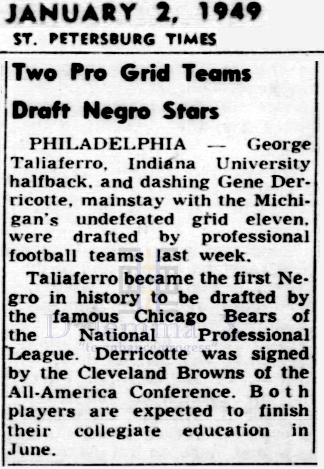 First African-American drafted by an NFL club: George Taliaferro, halfback (Indiana). Picked by the Chicago Bears in the thirteenth round of the 1949 draft but elected to sign with the Los Angeles Dons of the AAFC. Played with the Dons 1949; New York Yanks 1950-51; Dallas 1952; Baltimore 1953-54; Philadelphia 1955