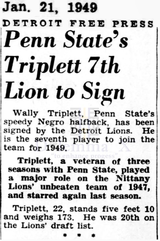 First African American draftee to play in the NFL: Wally Triplett, halfback (Penn State). Picked by the Detroit Lions in the nineteenth round of the 1949 draft. Played with Detroit 1949-1950; Chicago Cardinals 1952-53