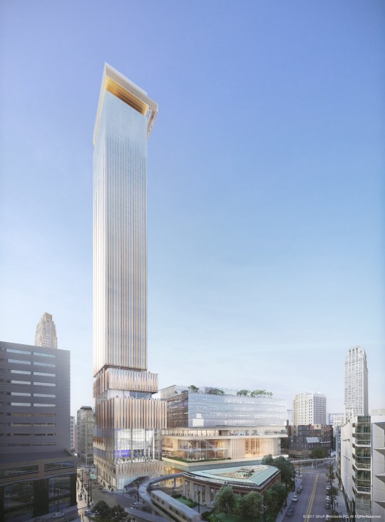 Bedrock Detroit’s $900 million, two-building project will include the 58-story residential tower and 12-floor building for retail and conference space. Up to 450 residential units can be built in the tower.