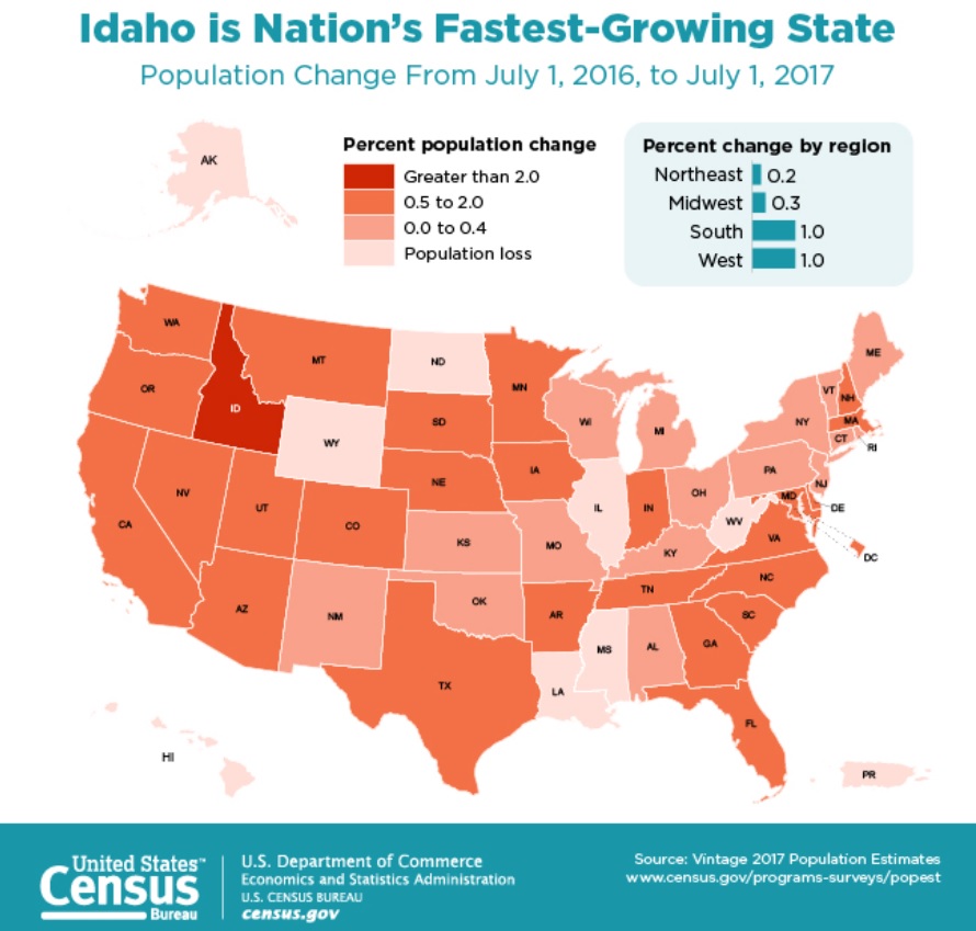 Idaho was the nation’s fastest-growing state over the last year. Its population increased 2.2 percent to 1.7 million from July 1, 2016, to July 1, 2017, according to the U.S. Census Bureau’s national and state population estimates released today.