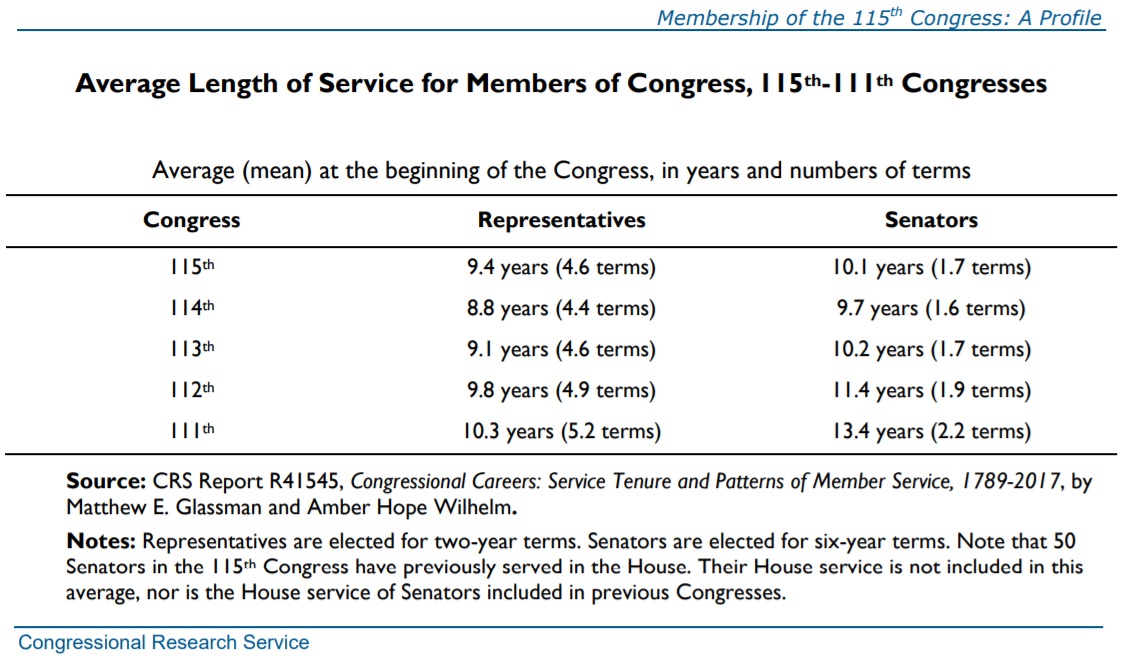 The average length of service for Representatives at the beginning of the 115th Congress was 9.4 years (4.7 House terms); for Senators, 10.1 years (1.7 Senate terms).