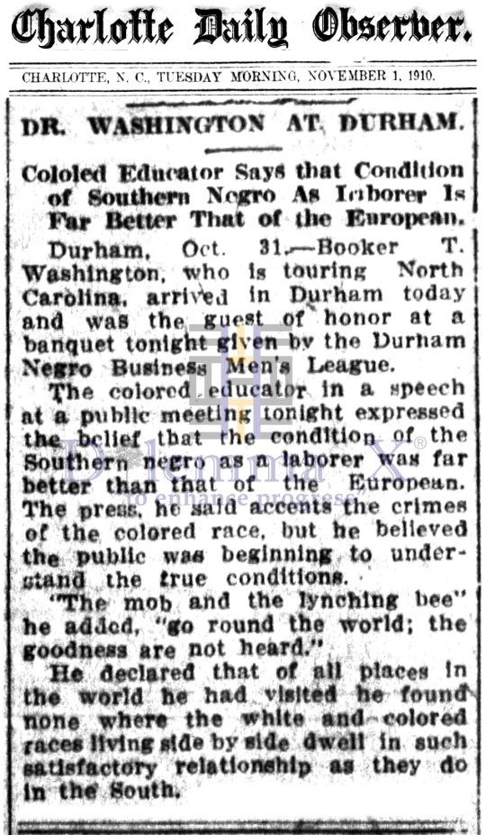 When Booker T. Washington visited Durham NC, Duke University and toured the state of North Carolina