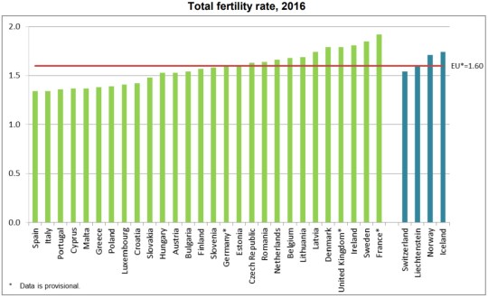 - Overall, the total fertility rate in the EU stood at 1.60 births per woman in 2016. It varied between Member States from 1.34 in both Spain and Italy to 1.92 in France.