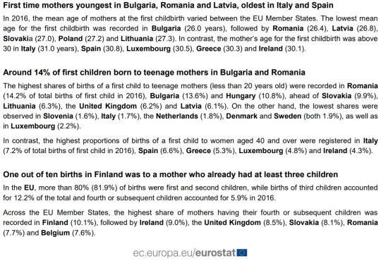 - On average in the EU, women who gave birth to their first child in 2016 were 29 years old. Across Member States, first time mothers were on average the youngest in Bulgaria and the oldest in Italy.