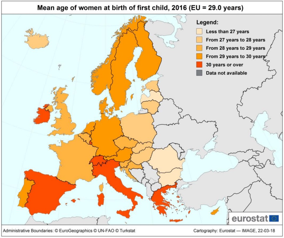 - On average in the EU, women who gave birth to their first child in 2016 were 29 years old. Across Member States, first time mothers were on average the youngest in Bulgaria and the oldest in Italy.