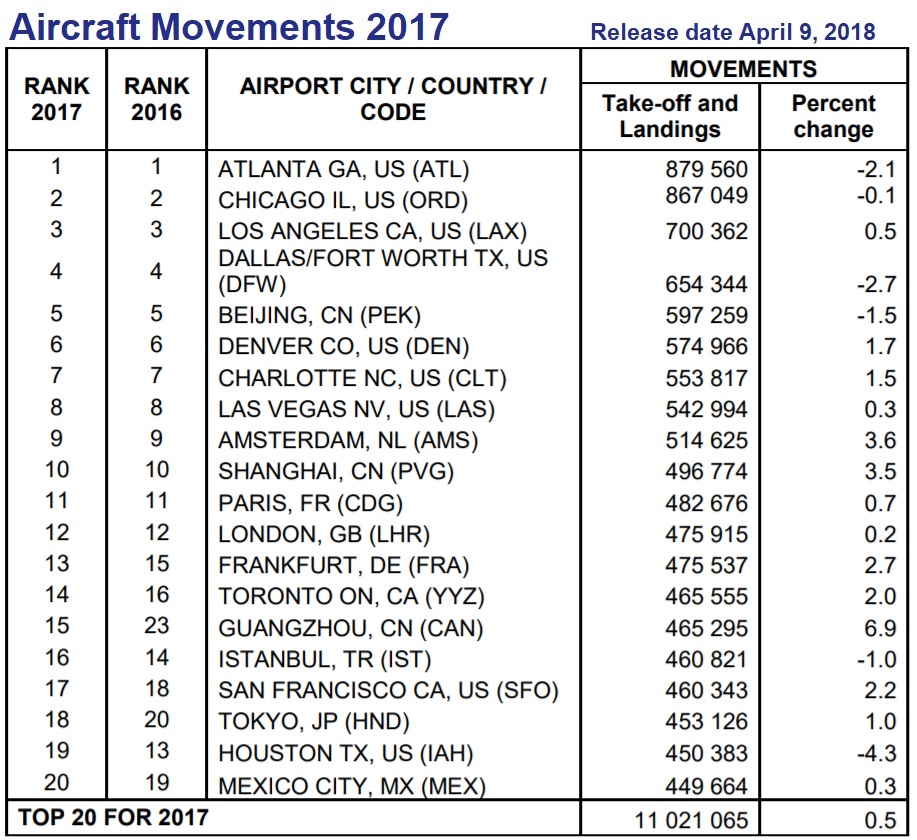 ACI World releases preliminary 2017 world airport traffic rankings Passenger traffic: Indian and Chinese airports major contributors to growth Air cargo: Volumes surge at major hubs as trade wars threaten. Release Date: April 09, 2018
