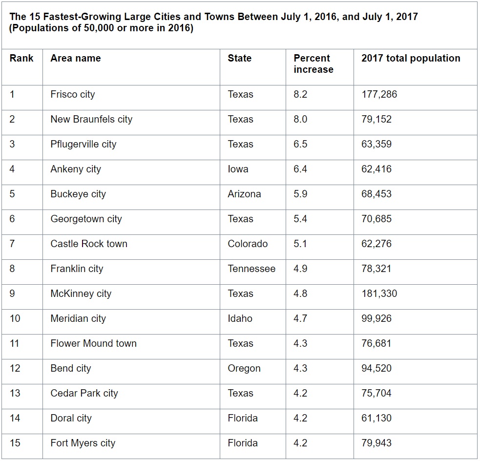 Regarding percentage change in population, 10 of the 15 fastest-growing large cities were located in the South, with seven in Texas. Between 2016 and 2017, Frisco, Texas (near Dallas), was the fastest-growing large city (population of 50,000 or more) at 8.2 percent, making its growth rate more than 11 times faster than the nation’s growth rate of 0.7 percent. See below for some of the other fastest-growing large cities.