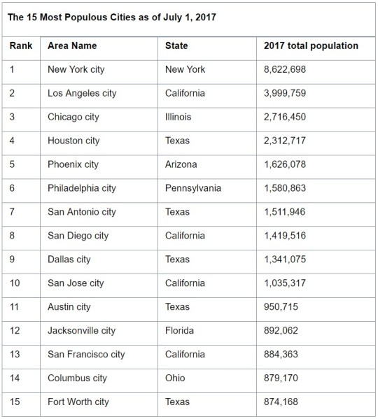 | 1 | New York city, New York | 8,175,133 | 8,622,698 |