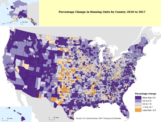 The nation’s housing stock increased by 5.7 million units (4.3 percent) since April 1, 2010. North Dakota was the fastest-growing state in terms of housing units, with an increase of 18.0 percent during the same period. Rounding out the top five states in percent gain were Utah (10.7 percent), Texas (9.6 percent), Idaho (8.1 percent) and South Dakota (8.0 percent).