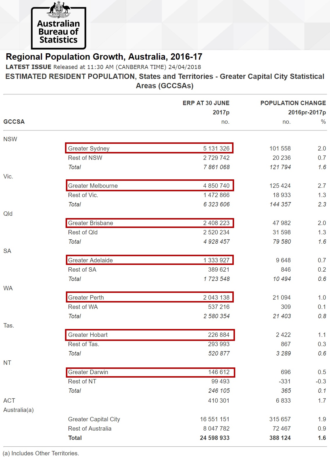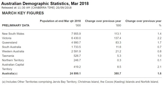Overall, Australia’s population grew by 380,700 people to reach 24.9 million in the year ending March 2018.