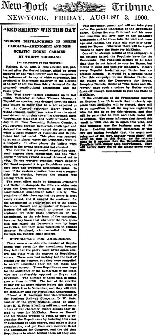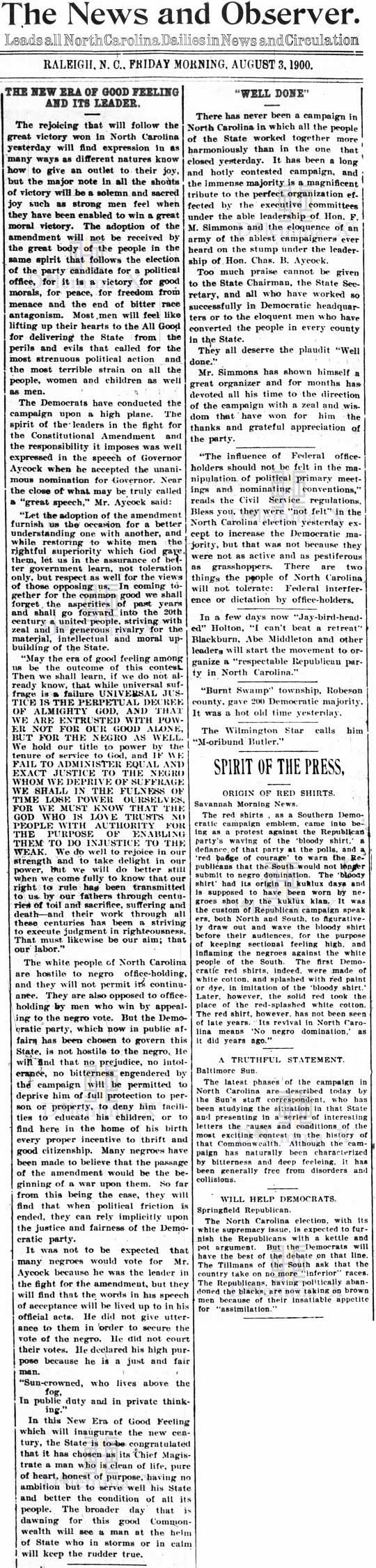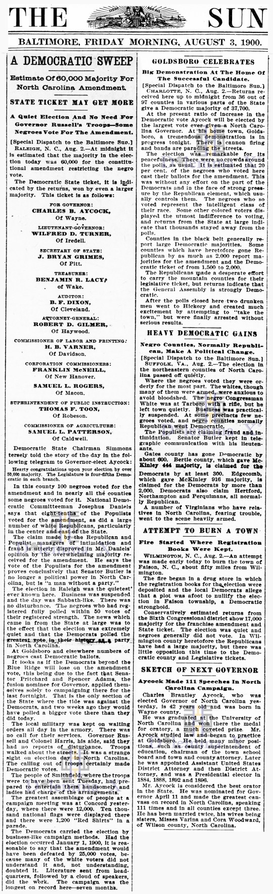 August 3, 1900 A view from Charlotte – “A White Supremacy Landslide”