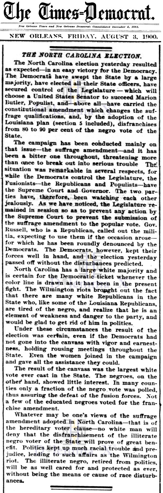 August 3, 1900 A view from Norfolk, Virginia – “North Carolina Redeemed by The White People”, “Negroes Relegated To The Rear”