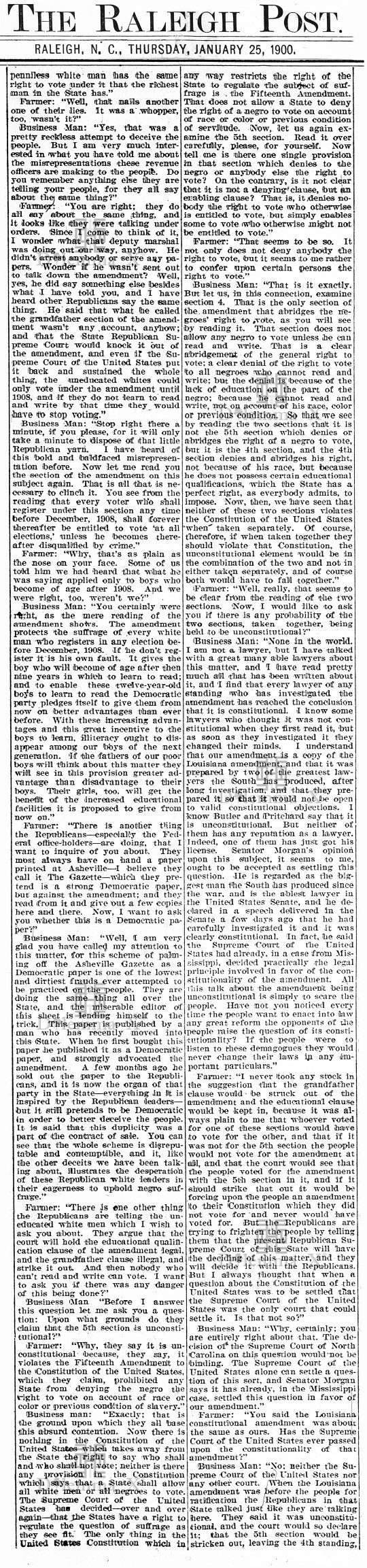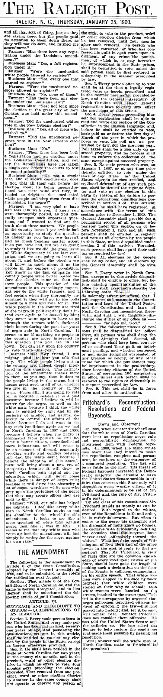 This historical flashback takes a look at the state of North Carolina in the year 1900 via newspaper articles from the period of disenfranchisement. Can this happen again? You decide.