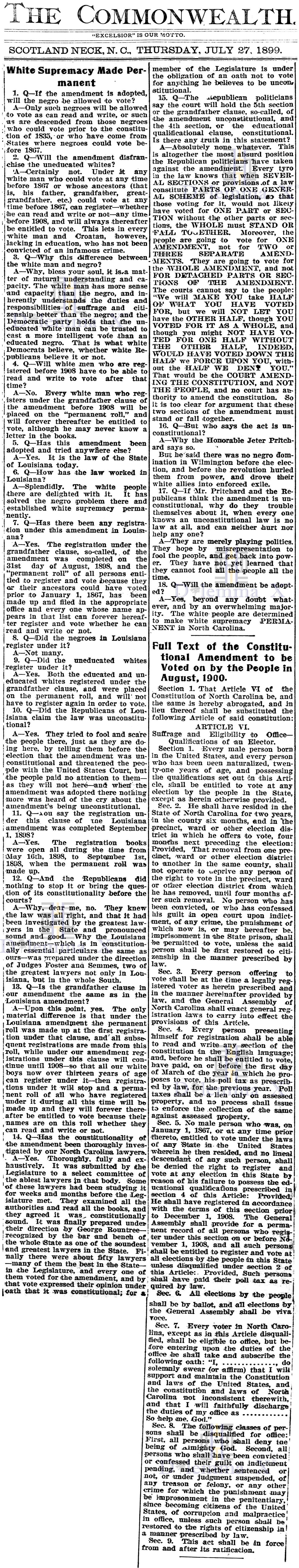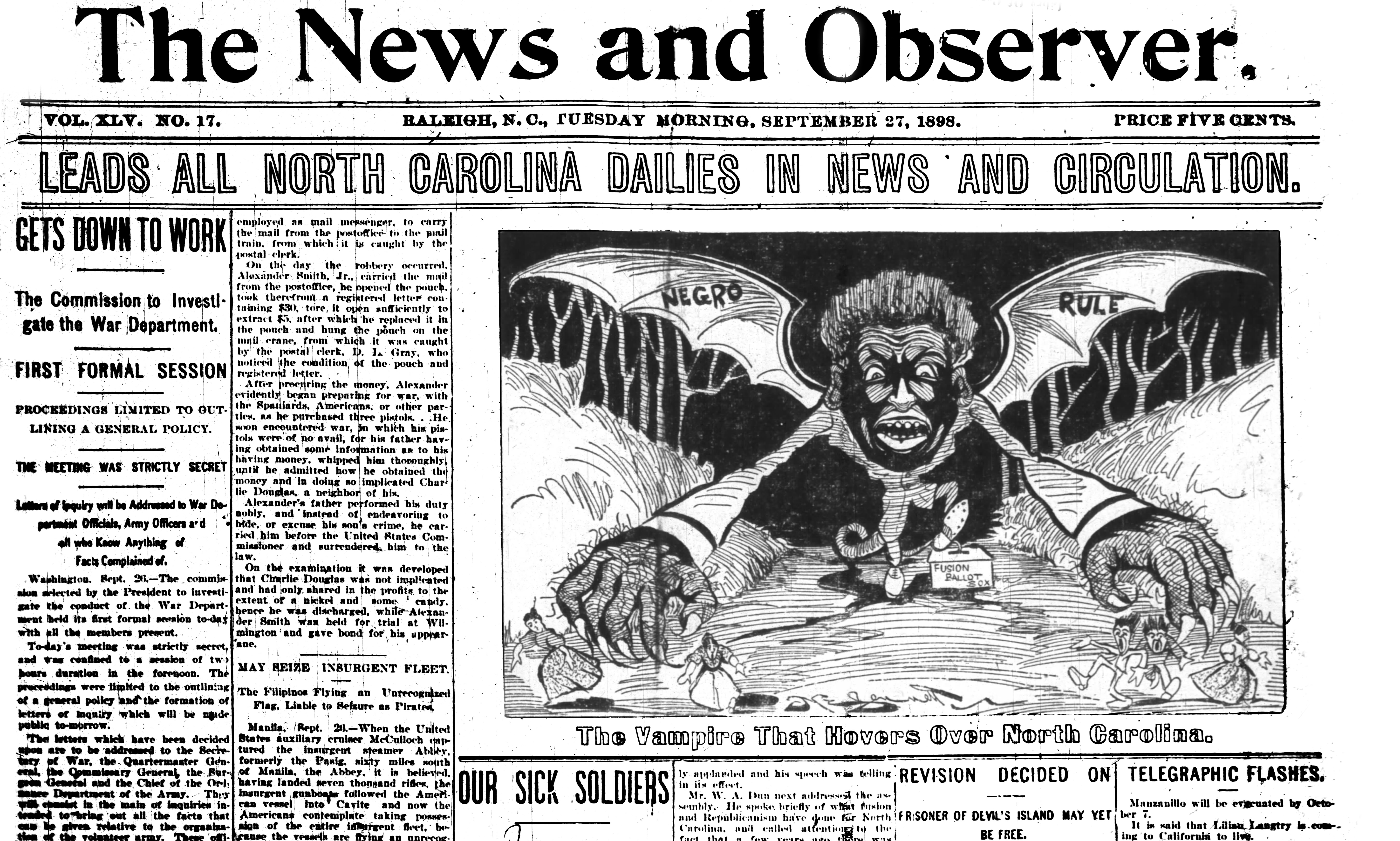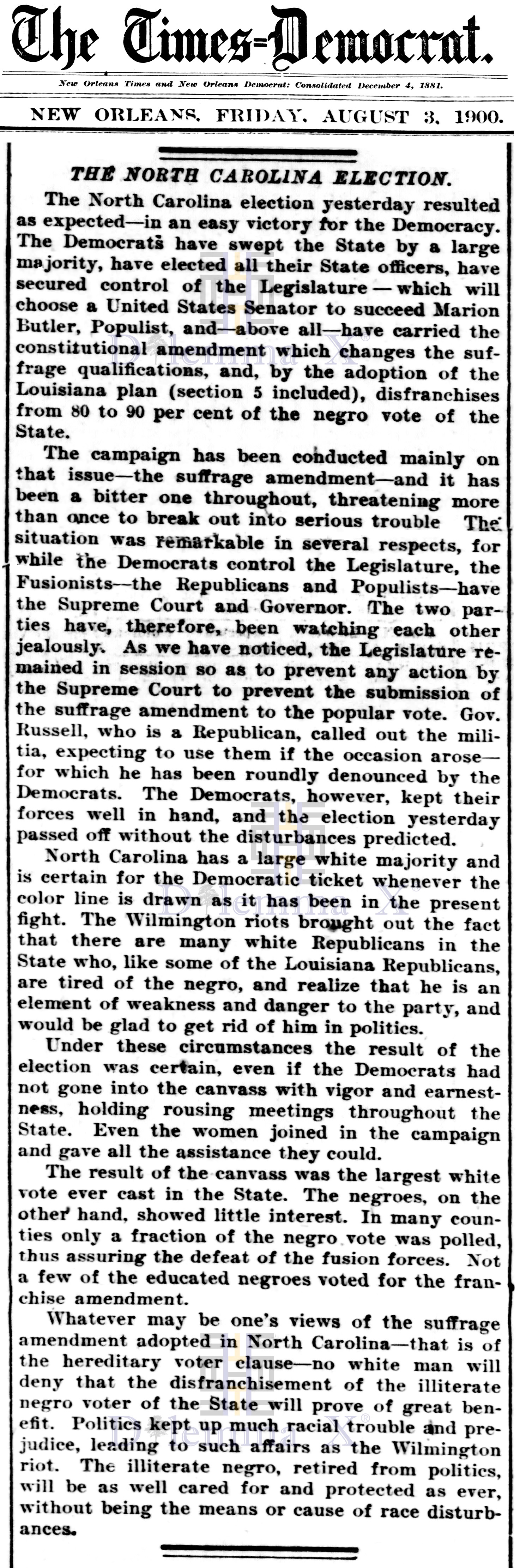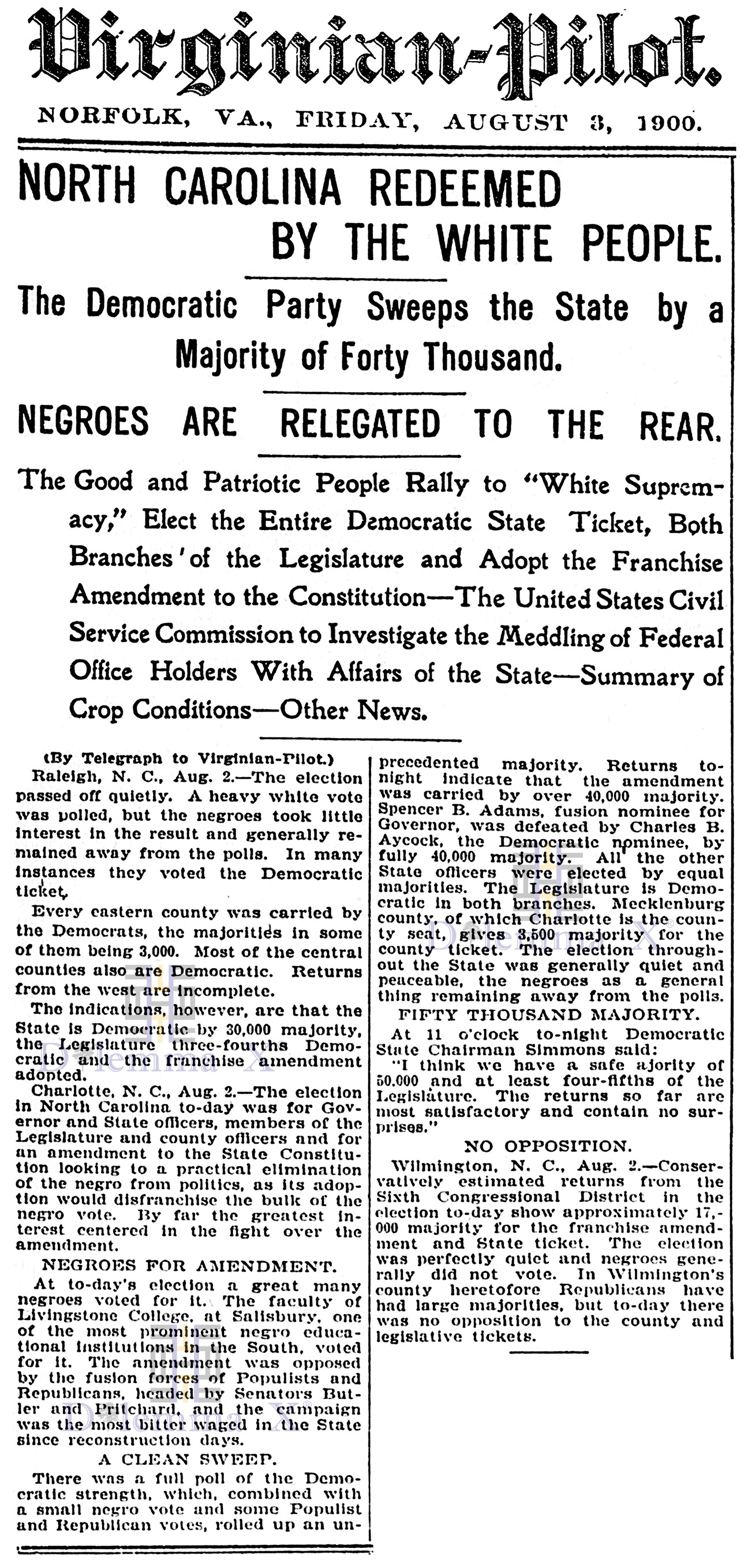 August 3, 1900 A view from Norfolk, Virginia – “North Carolina Redeemed by The White People”, “Negroes Relegated To The Rear”