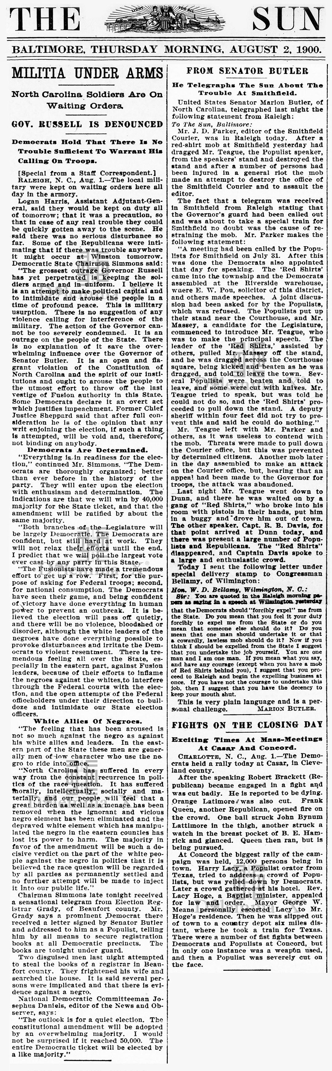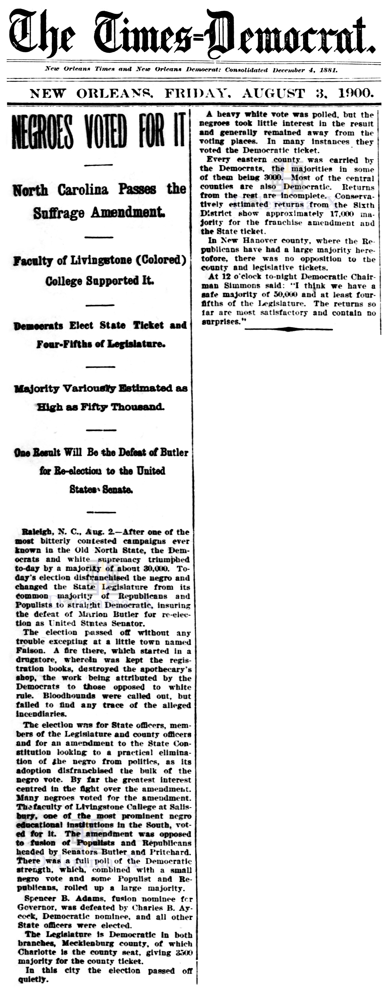 August 3, 1900 A view from Charlotte – “A White Supremacy Landslide”