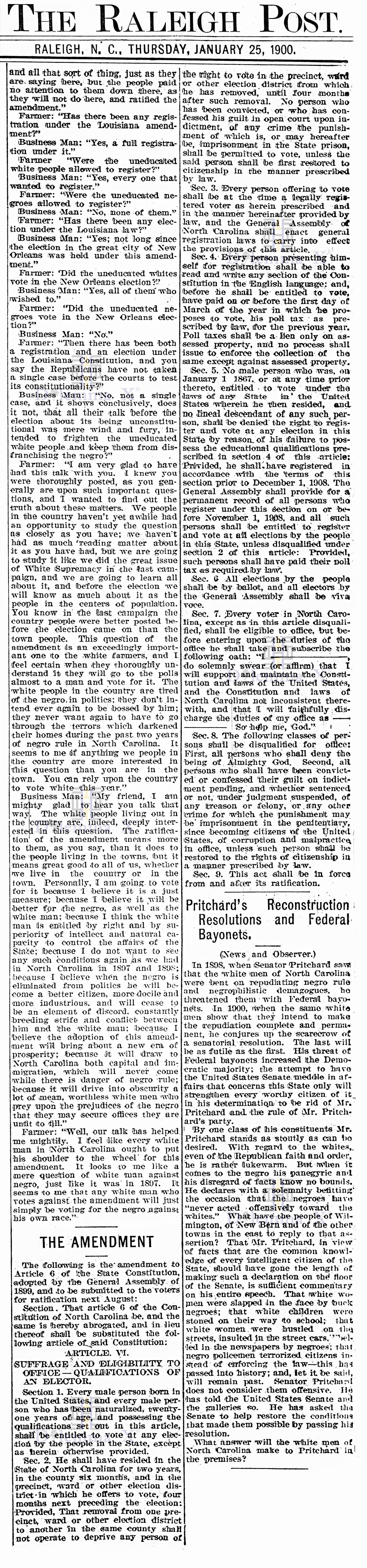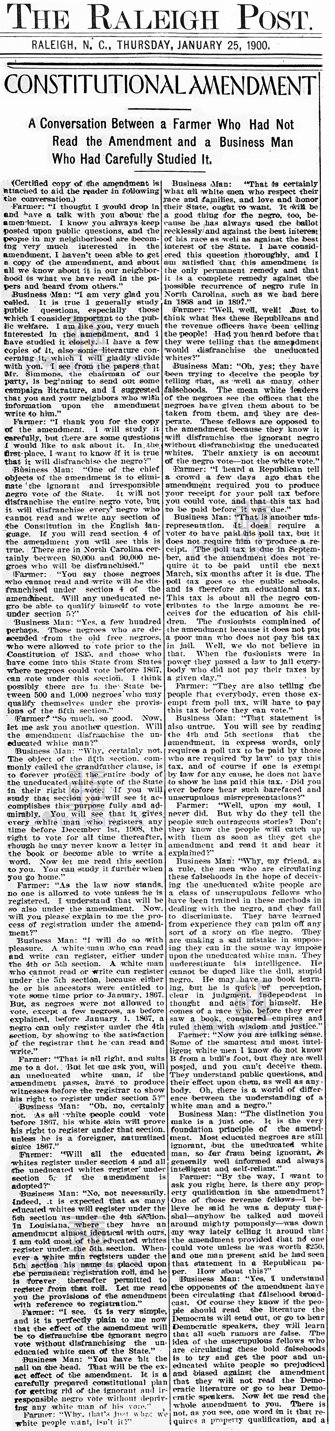 This historical flashback takes a look at the state of North Carolina in the year 1900 via newspaper articles from the period of disenfranchisement. Can this happen again? You decide.