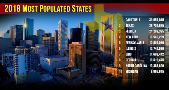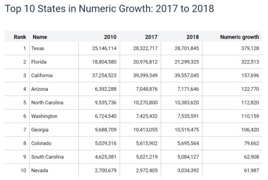 - Texas had the largest numeric growth over the last year, with an increase of 379,128 people. Texas grew both from having more births than deaths and from net gains in movers from within and outside the United States.