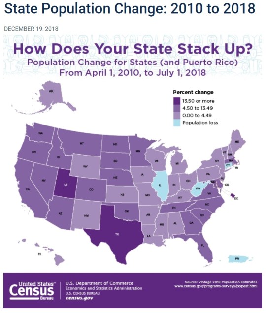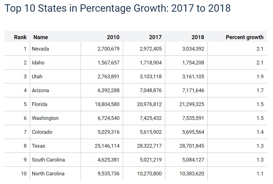 DEC. 19, 2018 — The U.S. population grew by 0.6 percent and Nevada and Idaho were the nation’s fastest-growing states between July 1, 2017, and July 1, 2018. Both states’ populations increased by about 2.1 percent in the last year alone. Following Nevada and Idaho for the largest percentage increases in population were Utah (1.9 percent), Arizona (1.7 percent), and Florida and Washington (1.5 percent each).