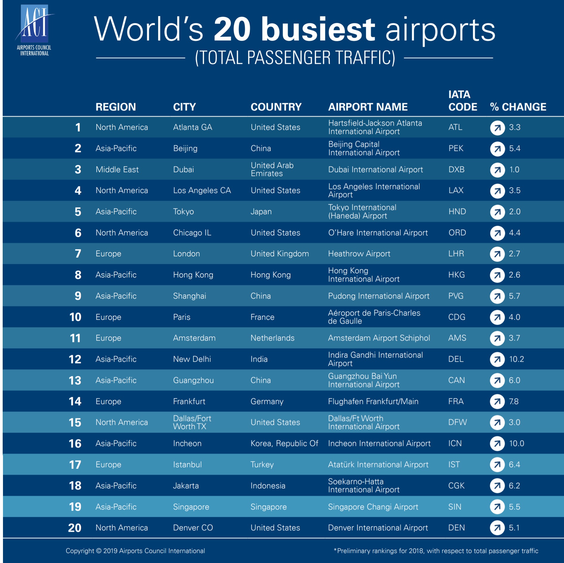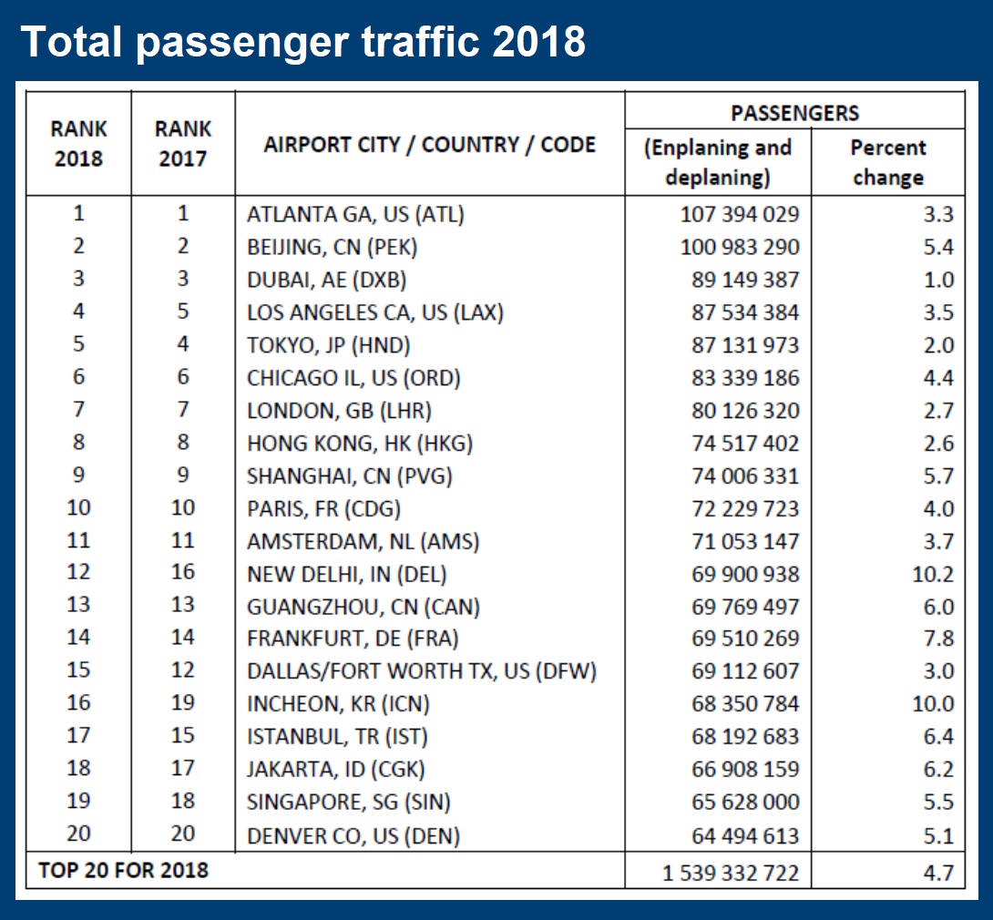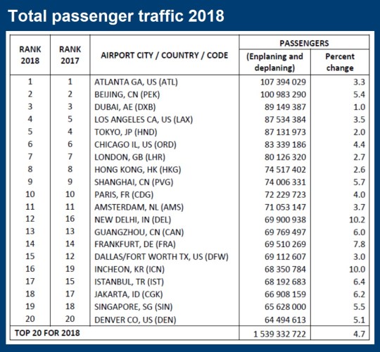 London, 13 March, 2019 – During the the 11th Annual Airport Economics & Finance Conference & Exhibition in London, Airports Council International (ACI) World published its preliminary world airport traffic rankings covering passenger traffic, cargo volumes, and aircraft movements