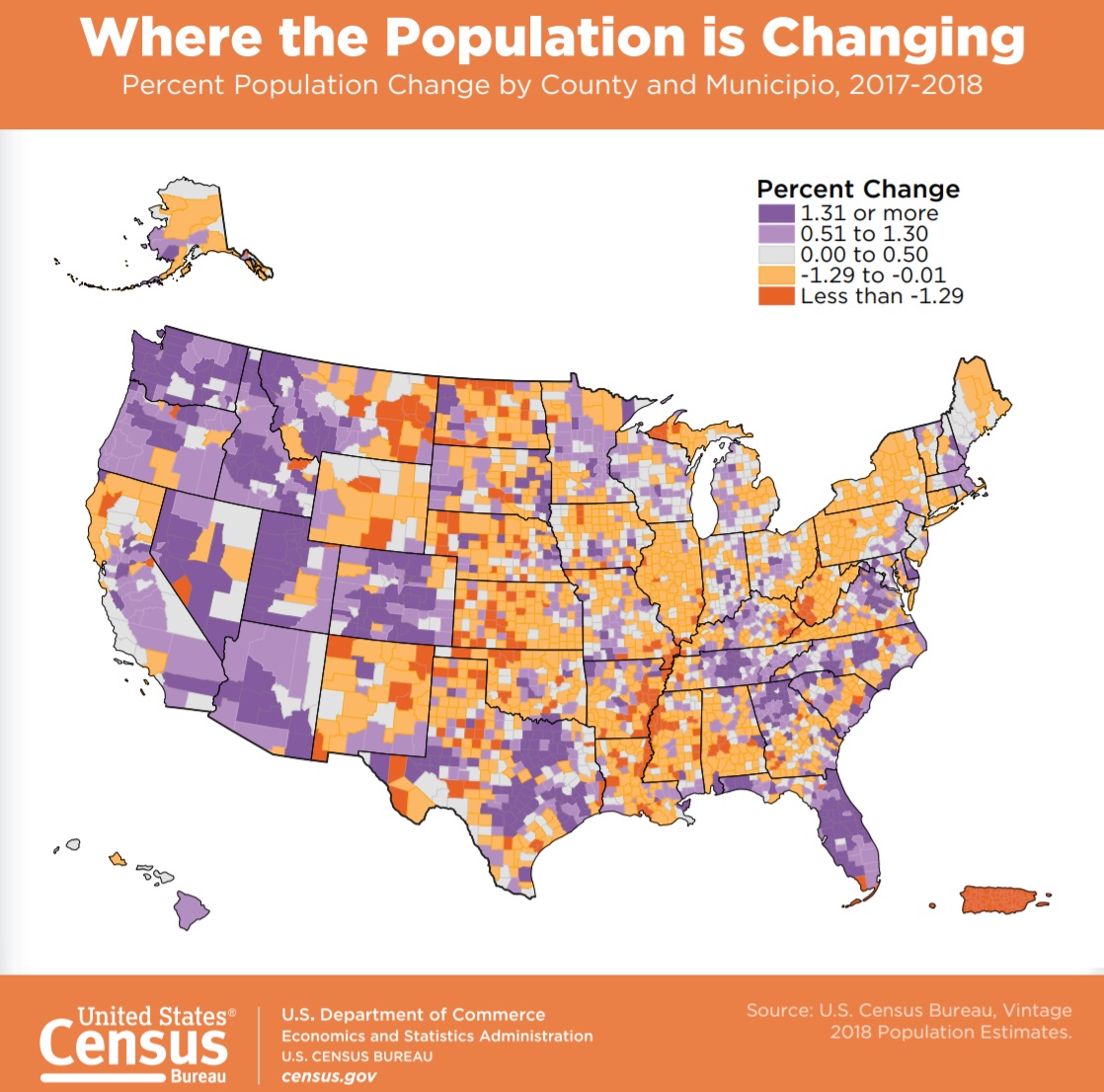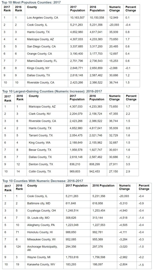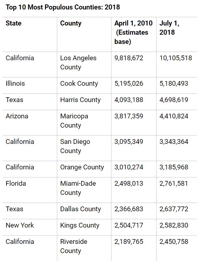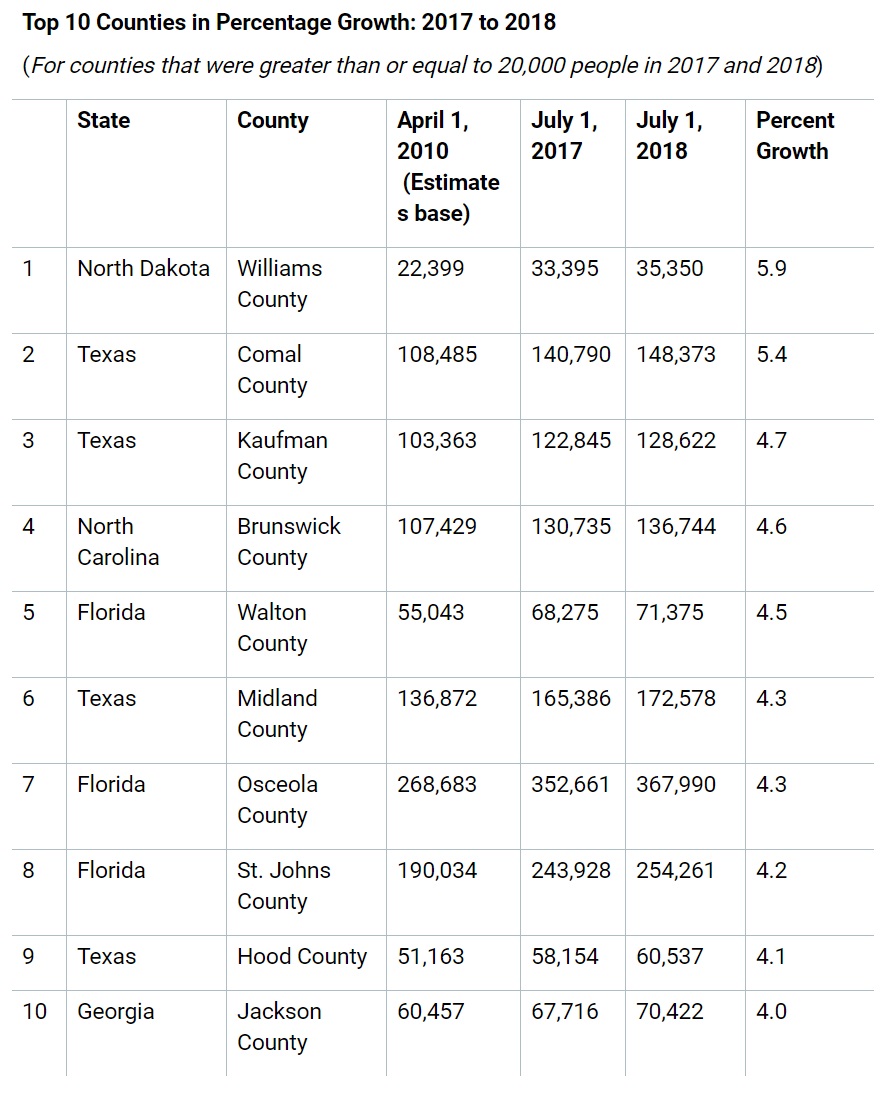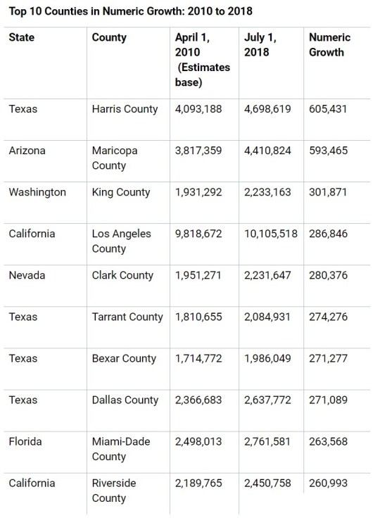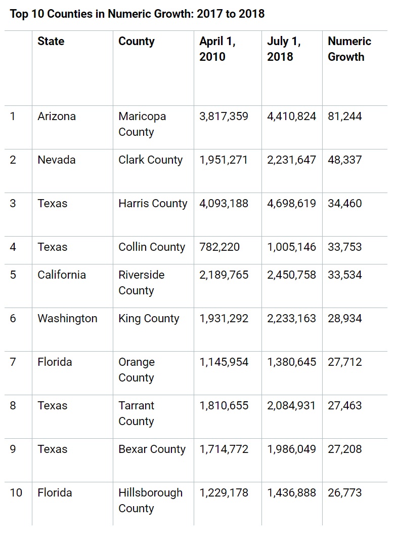 APRIL 18, 2019 — Counties with the largest numeric growth are all located in the south and the west, with counties in Texas taking four out of the top 10 spots according to new U.S. Census Bureau population estimates released April 18, 2019.